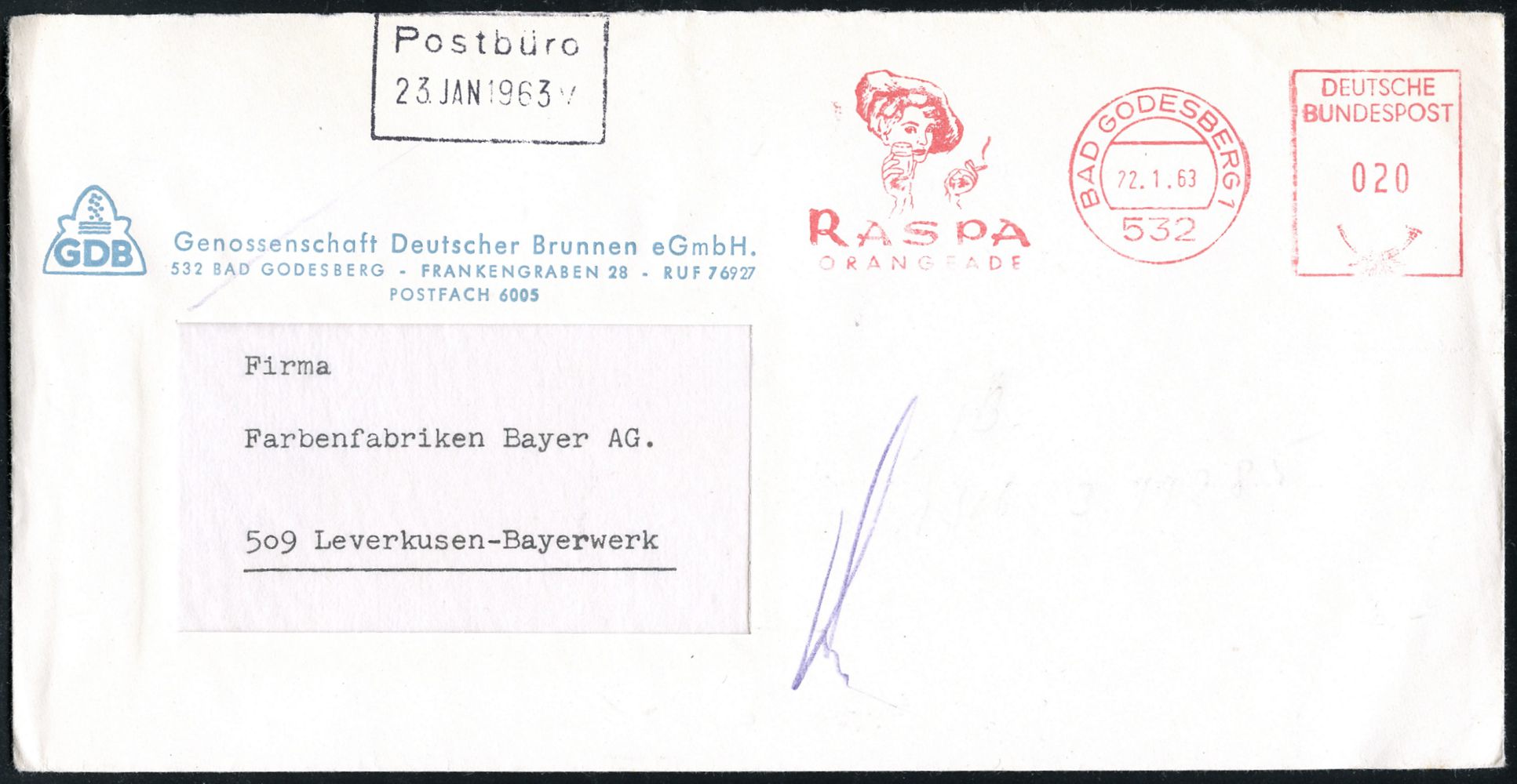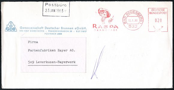 10011 | 15 € | 5320 BAD GODESBERG : 532 BAD GODESBERG 1/ RASPA/ ORANGEADE 1964 (22.1.) AFS Postalia (Frau mit Hut, Zigarette u. Saftglas) Firmen-Bf: Genossenschaft Deutscher Brunnen.. (Dü.E-26B) | ![]() | |
