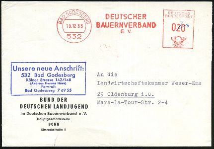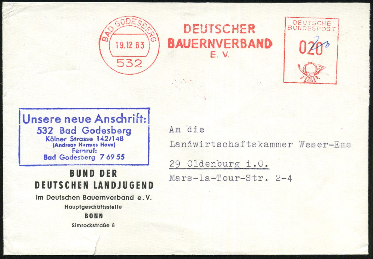10012 | 14 € | 5320 BAD GODESBERG : 532 BAD GODESBERG/ DEUTSCHER/ BAUERNVERBAND/ EV 1963 (19.12.) AFS Francotyp auf Vordr.Bf.: BUND DER DEUTSCHEN LANDJUGEND + zugestempelt neue Adresse (Ra.6):.. Andreas Hermes-Haus (Dü.E-23CO) | ![]() | |