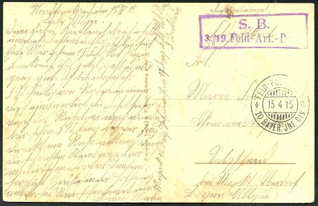 9979 | 15 € | 5320 BAD GODESBERG : Bad Godesberg 1915 (15.4.) 2K-Gitter: FELD-POST-EXPED./a/10. BAYER. JNF. DIV (oben nicht ganz voll) + viol Ra.2: S. B./ 3. (Batterie) 19. Feld-Art.-Reg. auf s/w.-Feldpost-Ak.: Godesberg Rheinpromenade ins Allgäu | ![]() ![]() | |