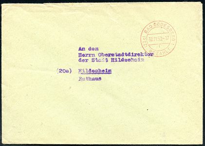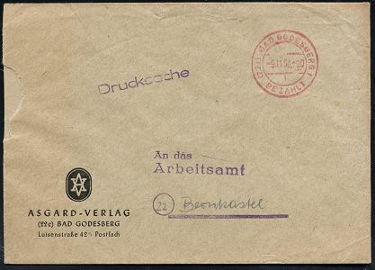 10001 | 5 € | 5320 BAD GODESBERG : (22c) BAD GODESBERG 1/ l/ BEZAHLT 1954 (5.11.) roter 2K-Steg PFS auf Firmen-Bf.: ASGARD-VERLAG.. (schwache Bräunung u.Mäng.) n, Bernkastel (Dü.A-7, Nr.32) | ![]() | |