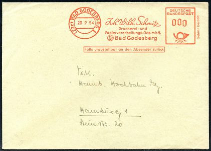 10000 | 25 € | 5320 BAD GODESBERG : (22c) BAD GODESBERG 1/ Joh.Wilh.Scjmitz/ Druckerei-u.Papierverarbeitungs-Ges.m.b.H.. 1954 (20.9.) AFS Francotyp mit Zusatz: Gebühr bezahlt im B u c h d r u c k ! = vorschriftmäßige "000"-Stellung für Massen-Drs. (ab 1. Juli 1954) mit Unzustellbarkeitsvermerk. Fern-Drs.-Bf. n. Hamburg kuriose Freistempel-Verwendung! (Dü.E-23CG im Buchdruck) | ![]() | |