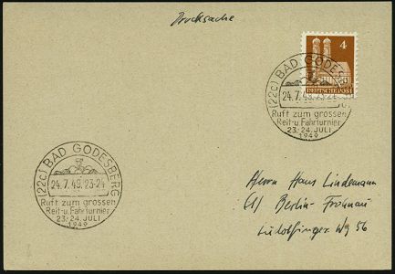 9995 | 16 € | 5320 BAD GODESBERG : (22c) BAD GODESBERG/ Ruft zum grossen/ Reit-u.Fahrturnier 1949 (24.7.) seltener SSt (Turm) klar gest. Inl.-Karte (Bo.6) | ![]() | |