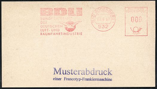 10014 | 15 € | 5320 BAD GODESBERG : 532 BAD GODESBERG 1/ BDLI/ BUNDESVERBAND/ DER/ DEUTSCHEN/ LUFT-U./ RAUMFAHRTINDUSTRIE 1967 (22.8.) AFS Francotyp in 000 (Adler-Logo) + 1L: Musterdruck, kleine Archivkarte (Dü.E-26) | ![]() | |