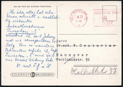 9996 | 16 € | 5320 BAD GODESBERG : BAD GODESBERG/ k/ DEUTSCHE POST 1951 (7.6.) PFS Querrechteck "Posthorn" auf Firmen-Pharma-Reklame-Kt.: DOLORGIET ("Puraeton E") s/w.-Foto-Ak.: Histor. Ansicht des Mittelrheins mit Dampfschlepper u. Segelschiff n. Hannover (Dü.D-15, Nr.271 = Ziffer freistehend) | ![]() ![]() | |