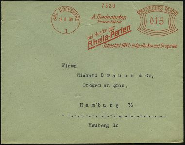 9985 | 20 € | 5320 BAD GODESBERG : BAD GODESBERG/ 1/ A.Diedenhofen/ Pharm.Fabrik/ bei Husten nur/ Rheila-Perlen.. 1930 (18.8.) AFS Francotyp "Bogenrechteck" klar auf Fern-Bf. (Dü.E-1CEh) | ![]() | |