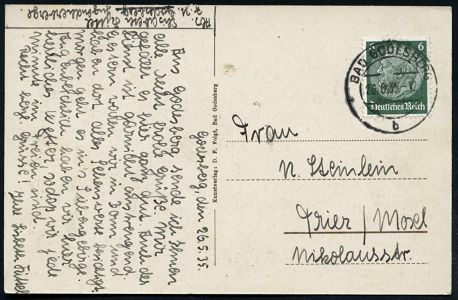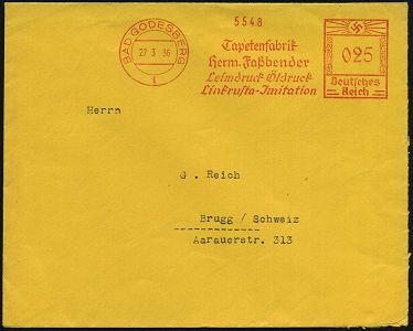 9989 | 22 € | 5320 BAD GODESBERG : BAD GODESBERG/ 1/ Tapetenfabrik/ Herm.Faßbender/ Leimdruck-Öldruck/ Linkrusta-Jmitation 1936 (27.3.) AFS Francotyp "Hakenkreuz" 025 Pf. , klar gest. Ausl.-Bf., vergl. Kat.-Nr. 9986 (Dü.E-3CEh) | ![]() | |