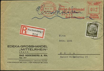 9991 | 30 € | 5320 BAD GODESBERG : BAD GODESBERG/ Edeka-Großhandel/ "Mittelrhein"/ e.GmbH 1940 (6.11.) AFS Francotyp "Reichsadler" 012 Pf. + Zusatz EF 30 Pf. Hinden-burg (Mi.523, EF + 70.-EUR = Einschreibgebühr + RZ: Bad Godesberg 1, Fern-R-Bf., seltene MiF (Dü.E-5CGo) | ![]() | |