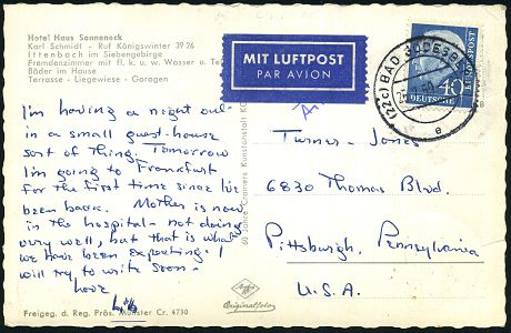 10007 | 18 € | 5320 BAD GODESBERG : (22c) BAD GODESBERG 1/ e 1959 (25.2.) 2K-Steg auf EF 40 Pf. Heuss II , klar gest., portorichtige Übersee-Flp.-Ak. (Ittenbach) n. U.S.A. (Mi.260 x EF) | ![]() ![]() | |