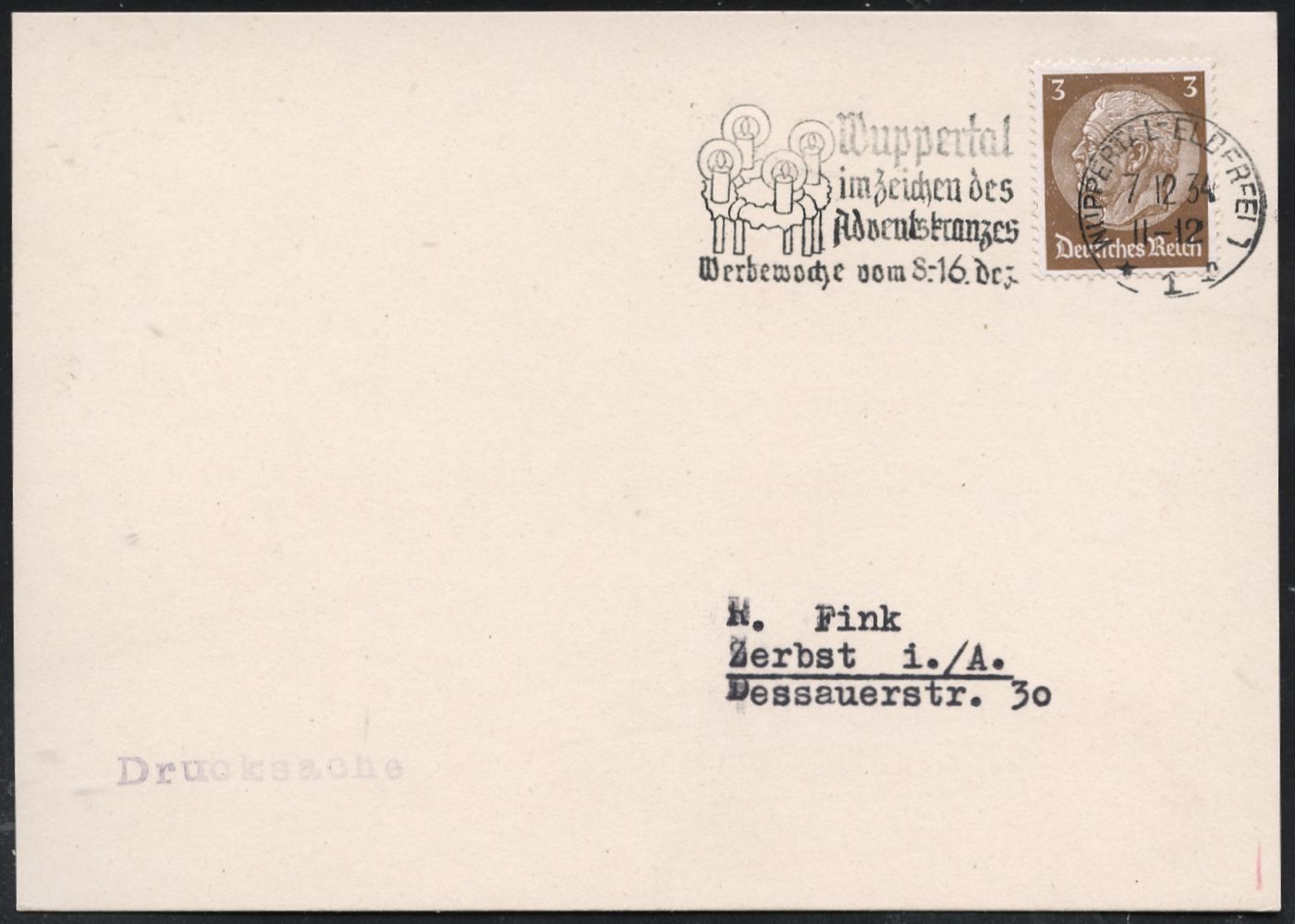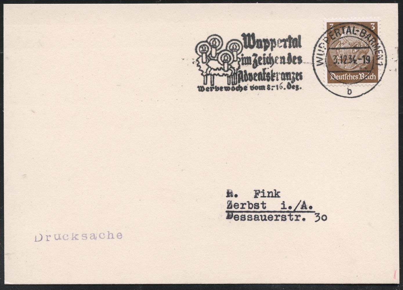 10121 | 18 € | 5600 WUPPERTAL (Maschinen- und Serienstempel) : WUPPERTAL-ELBERFELD/ * 1 b/ ..im Zeichen der/ Adventskranzes.. 1934 (5.12.) seltener MWSt (Adventskranz mit Kerzen) klar gest. Inl.-Karte (Bo.1 A II) | ![]() | |