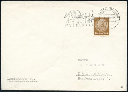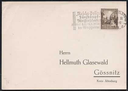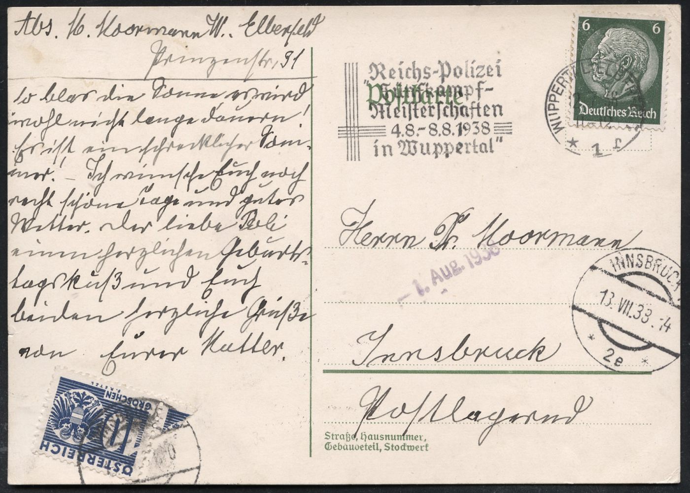 10123 | 28 € | 5600 WUPPERTAL (Maschinen- und Serienstempel) : WUPPERTAL-ELBERFELD/ *1r/ Reichs-Polizei/ Fünfkampf-/ Meisterschaften/ 4.8.-8.8. 1938 (2.7.) MWSt auf EF 6 Pf, Hindenbg. klar auf Ausl.-Kt. mit Inl.-Tarif n. Innsbruck, vs. AS. + österr. Portomarke 10 Gr. = Postlagergebühr !, seltener Bedarfs-Beleg (Bo.2 A I) | ![]() | |