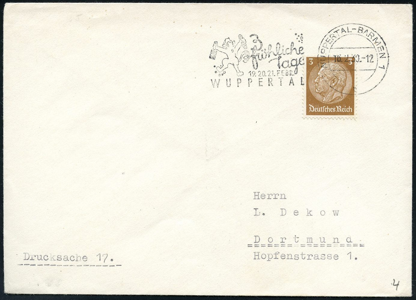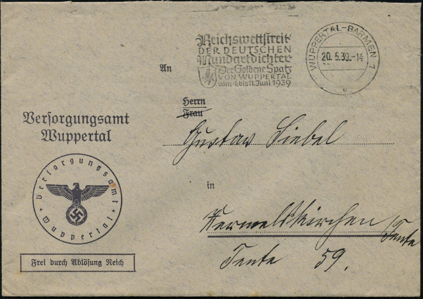 10125 | 18 € | 5600 WUPPERTAL (Maschinen- und Serienstempel) : WUPPERTAL-BARMEN 1/ b/ Reichswettstreit/ DER DEUTSCHEN/ Mundartdichter/ Der Goldene Spatz.. 1939 (20.5.) MWSt (Wappen mit Sperling) markenloser Dienst-Bf.: Versorgungsamt.. FdAR (unsichtbare Öffnungsmäng.) m i t Inhalt, 2 Belege kompl.!, vergl. Kat.-Nr. 10126 (Bo.5 A I = 2-Kreis-Ortsstpl.) | ![]() | |