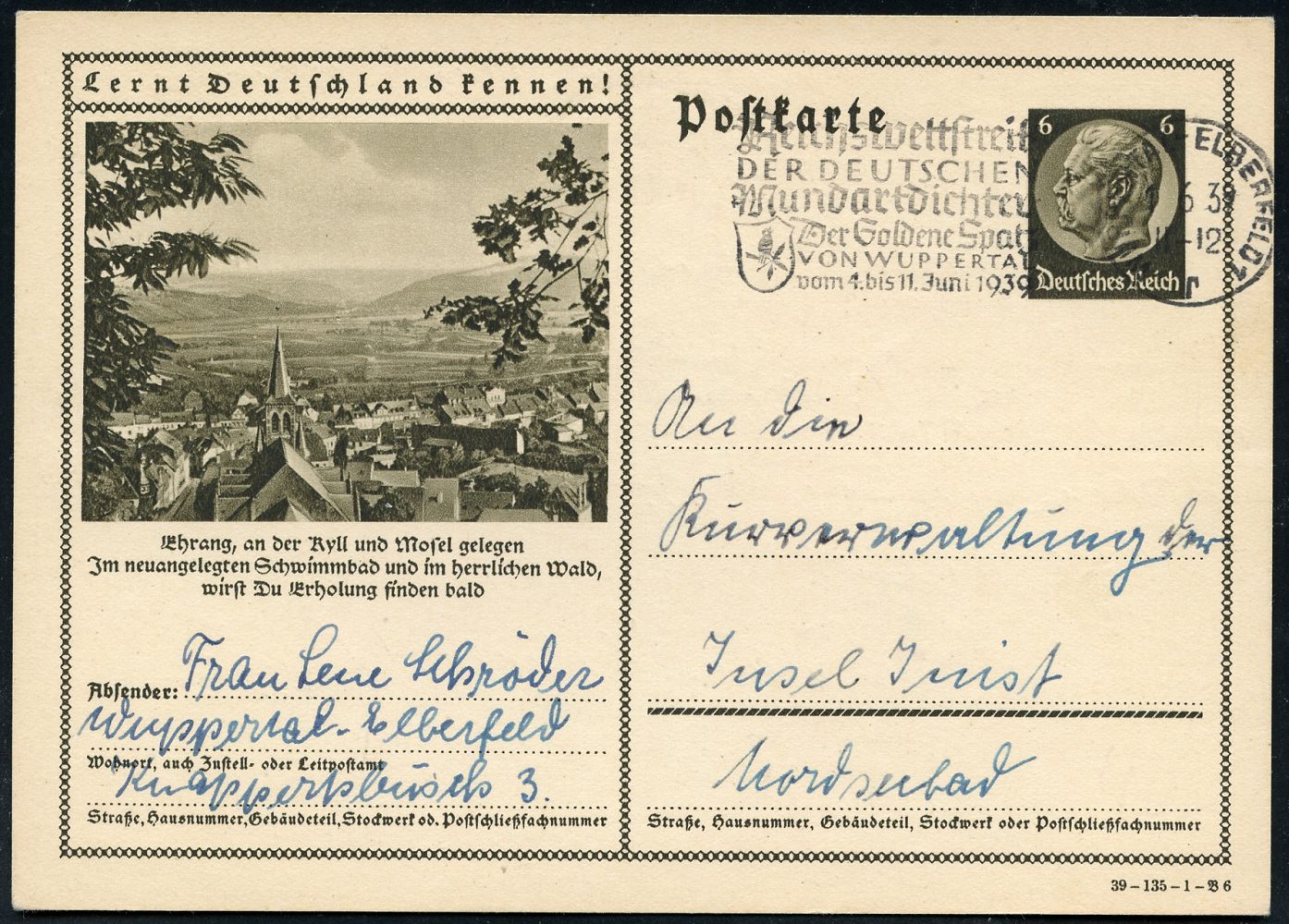 10127 | 18 € | 5600 WUPPERTAL (Maschinen- und Serienstempel) : WUPPERTAL-ELBERFELD 1/ r/ Reichswettstreit/ DER DEUTSCHEN/ Mundartdichter/ Der Goldene Spatz 1939 (4.6.) MWSt = Wappen mit Sperling auf BiP 3 Pf. Hindenbg., braun (Ehrang an der Kyll u. Mosel..) klar gest. Bedarfs-Kt., vergl. Los Nr. 6647 (Bo.5 A II mit 1-Kreis-Ortsstempel) | ![]() | |