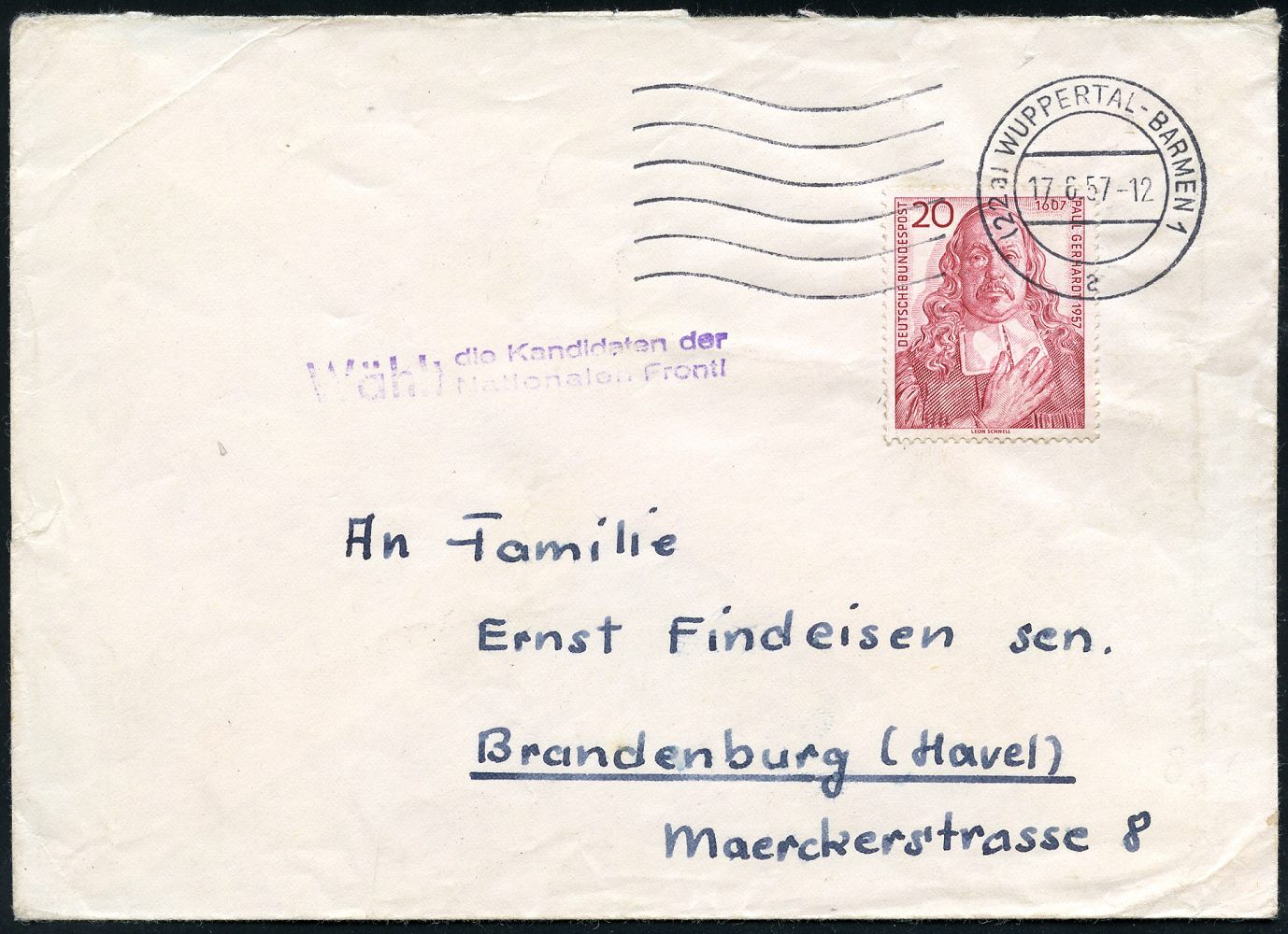 10129 | 20 € | 5600 WUPPERTAL (Maschinen- und Serienstempel) : (22a) WUPPERTAL-BARMEN 1/ a 1957 (17.6.) MaWellenSt auf EF 20 Pf. Paul Gerhard + viol. DDR-Propaganda-2L: Wählt die Kandidaten der/Nationalen Front , in der DDR zugestempelt!, Fernbf. n. Brandenbg./Havel, selten! (Mi.253 EF) | ![]() | |