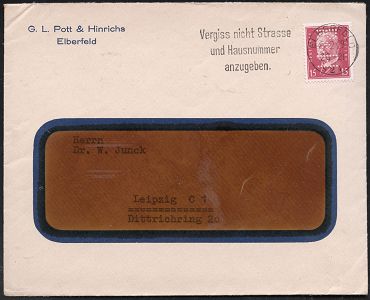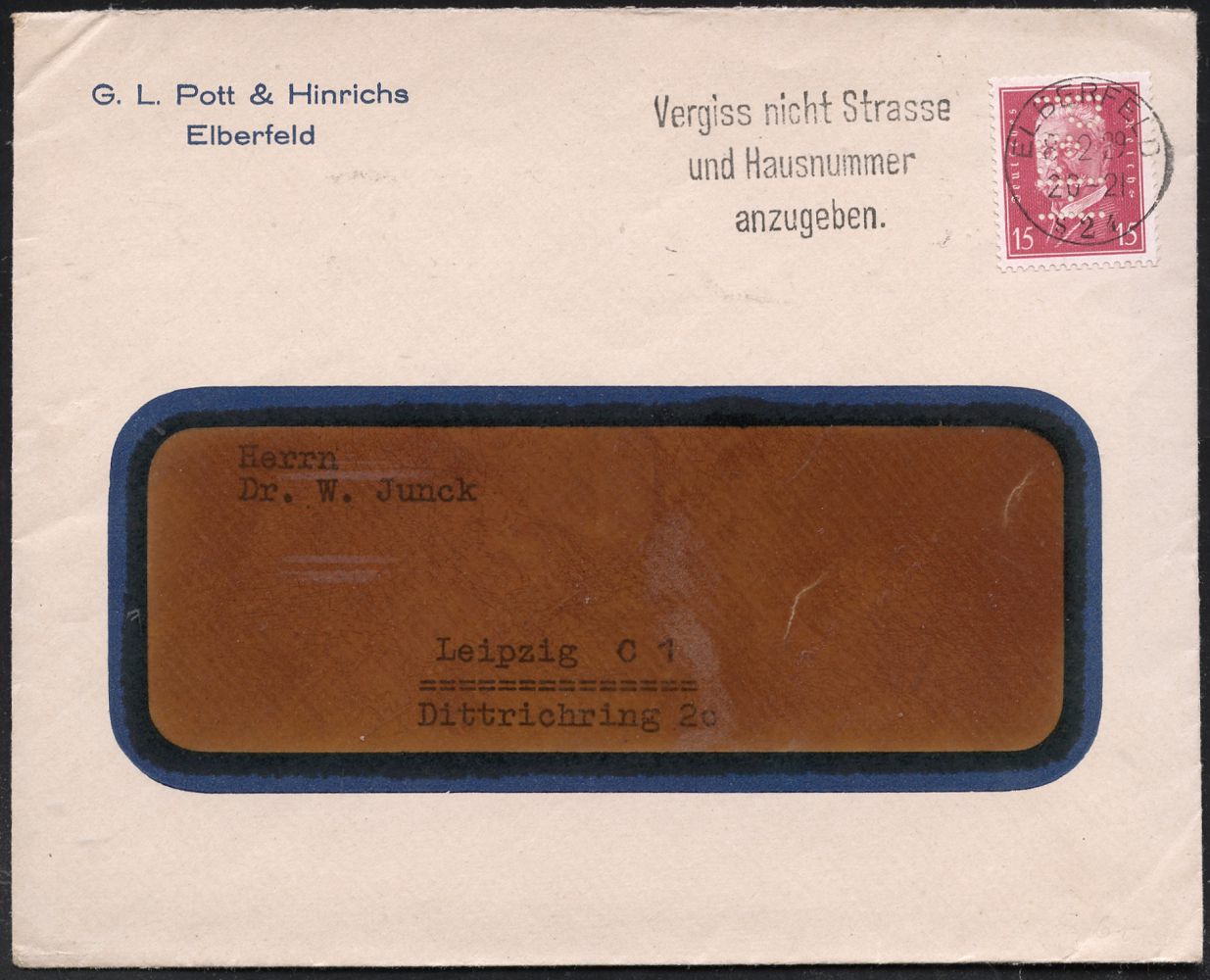 10119 | 18 € | 5600 WUPPERTAL (Maschinen- und Serienstempel) : Wuppertal-Elberfeld 1929 (8.2.) Serien-MWSt:: ELBERFELD/s 2 4/Vergiss nicht Strasse/u.Hausnummer.. auf EF 15 Pf. Hindenbg. mit Firmen-Lochung: P. & H. = G. L. Pott & Hinrichs (Mi.414 EF, Perfin) Fern-Bf. (Bo.S 60 A) | ![]() | |