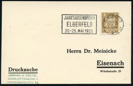 10118 | 18 € | 5600 WUPPERTAL (Maschinen- und Serienstempel) : Wuppertal-Elberfeld 1925 (12.5.) MWSt: ELBERFELD/* 2 S/JAHRTAUSENDFEIER/ELBERFELD.. , klar gest. Inl.-Drs.-Karte (Bo.5 A) | ![]() | |