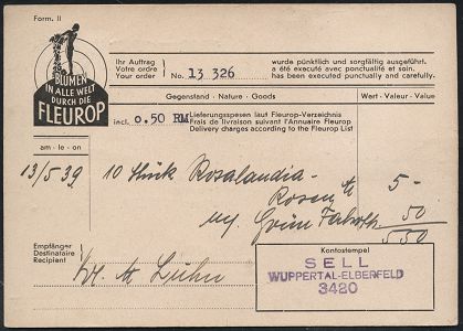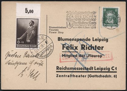 10126 | 28 € | 5600 WUPPERTAL (Maschinen- und Serienstempel) : WUPPERTAL-ELBERFELD 1/ r/ Reichswettstreit/ DER DEUTSCHEN/ Mundartdichter/ Der Goldene Spatz.. 1939 (22.5.) MWSt (Sperling) auf EF 8 Pf.Beethoven (Mi.389) = ungültig + roter Ra.: Nachgebühr.. (gestrichen), Nachfrankatur 6 + 19 Pf. Hitler (Mi.694, EF +15.- EUR) entwertet mit 1K-Segmen: LEIPZIG V1/a/ Nachträgl./ entwertet Inl.-Nachporto-Fleurop-Karte, Unikat ! (Bo.5 A II) | ![]() ![]() | |
