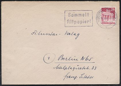 10128 | 18 € | 5600 WUPPERTAL (Maschinen- und Serienstempel) : WUPPERTAL-ELBERFELD 1/ q/ Sammelt/ Altpapier! 1949 (13.10.) seltener MWSt klar auf Inl.-Bf. n. West-Berlin (Bo.S 510 A, nur 1 1/2 Monate im Rheinland verwendet) | ![]() | |