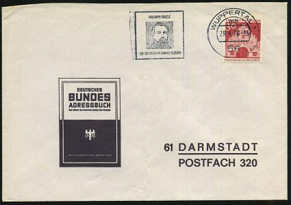 10130 | 14 € | 5600 WUPPERTAL (Maschinen- und Serienstempel) : 56 WUPPERTAL 1/ mh/ FRIEDRICH ENGELS/ VOR 150 JAHREN..GEBOREN 1970 (29.4.) MWSt = Friedrich Engels (Kopfbild) gefalteter Antwort-Bf. an Verlag Deutsches Bundes Adressbuch, 61 Darmstadt (Bo.42 A III) | ![]() | |