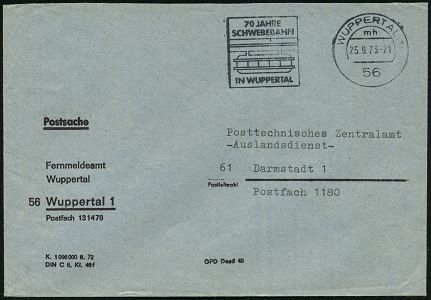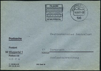 10131 | 18 € | 5600 WUPPERTAL (Maschinen- und Serienstempel) : 56 WUPPERTAL 1/ mh #bzw.# ml/ 70 JAHRE/ SCHWEBEBAHN 1971/73 2 verschied. MWSt = je Schwebebahn je klar auf Postdienstbf. (Einzelverkauf möglich: je 10.- EUR) 2 Belege (Bo.48 A I, II) | ![]() ![]() | |
