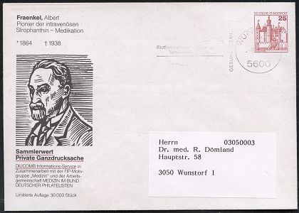 10132 | 12 € | 5600 WUPPERTAL (Maschinen- und Serienstempel) : WUPPERTAL 1/ 101/ GEBÜHR BEZAHLT/ ..melusin 1982 (Juni) Absenderstempel = Vorausentwertung (etw. schwach) auf passendem PU 25 Pf. Burgen, rot: Albert Fraenke, Pionier der intravenösen, Strophantin-Medikation (Brustbild) Inl.-Bf. (Mi.PU 248/5) | ![]() | |