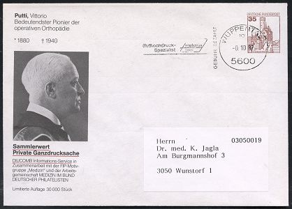 10133 | 14 € | 5600 WUPPERTAL (Maschinen- und Serienstempel) : 5600 WUPPERTAL/ 101/ GEBÜHR BEZAHLT/ Bluthochdruck../ melusin 1982 (Okt.) Absenderstempel = Vorausentwertung auf passendem PU 35 Pf- Burgen, braun: Vittorio Putti.. Pionier der operativen Orthopadie (Kopfbild) Inl.-Bf. (Mi.PU 250/13) | ![]() | |