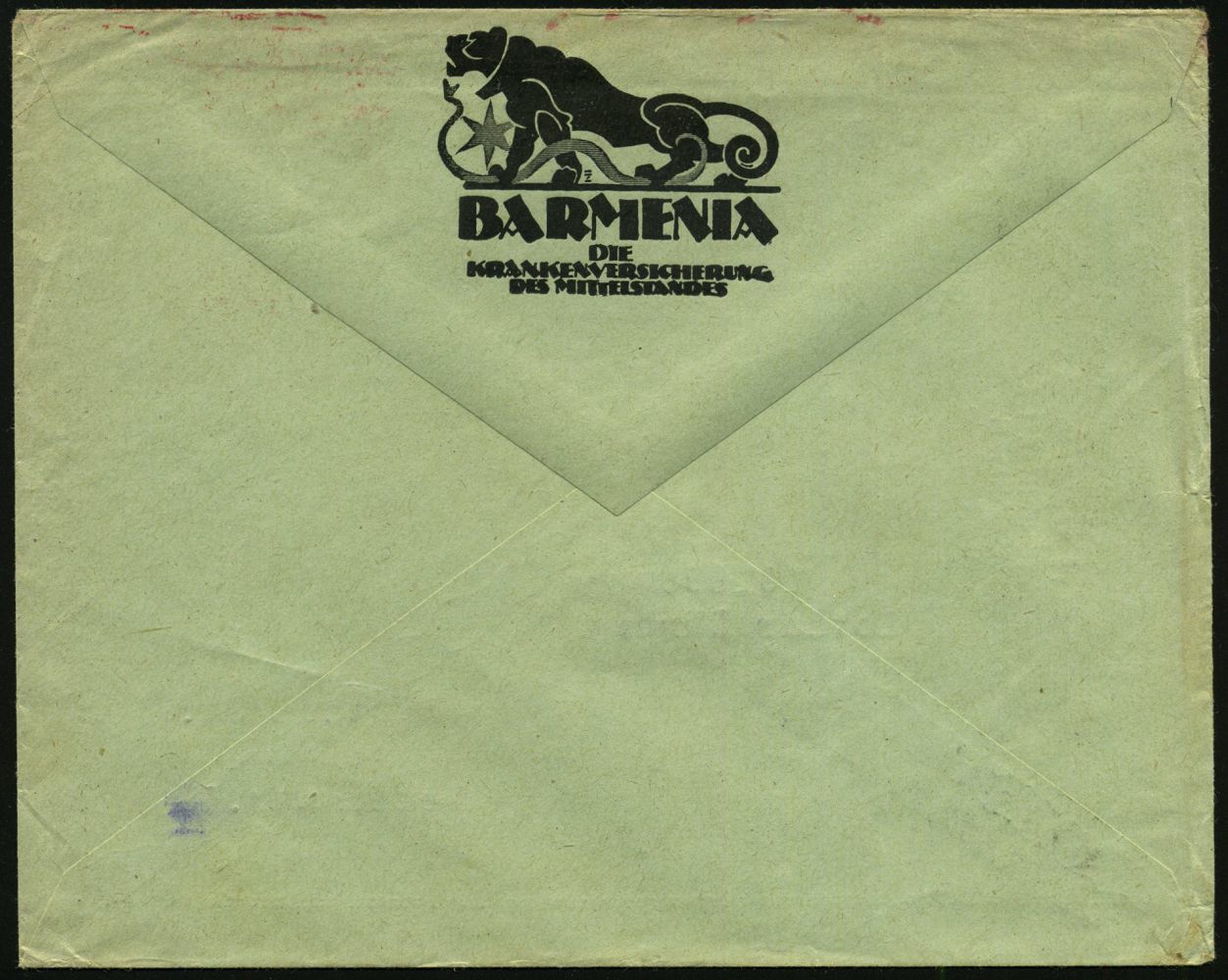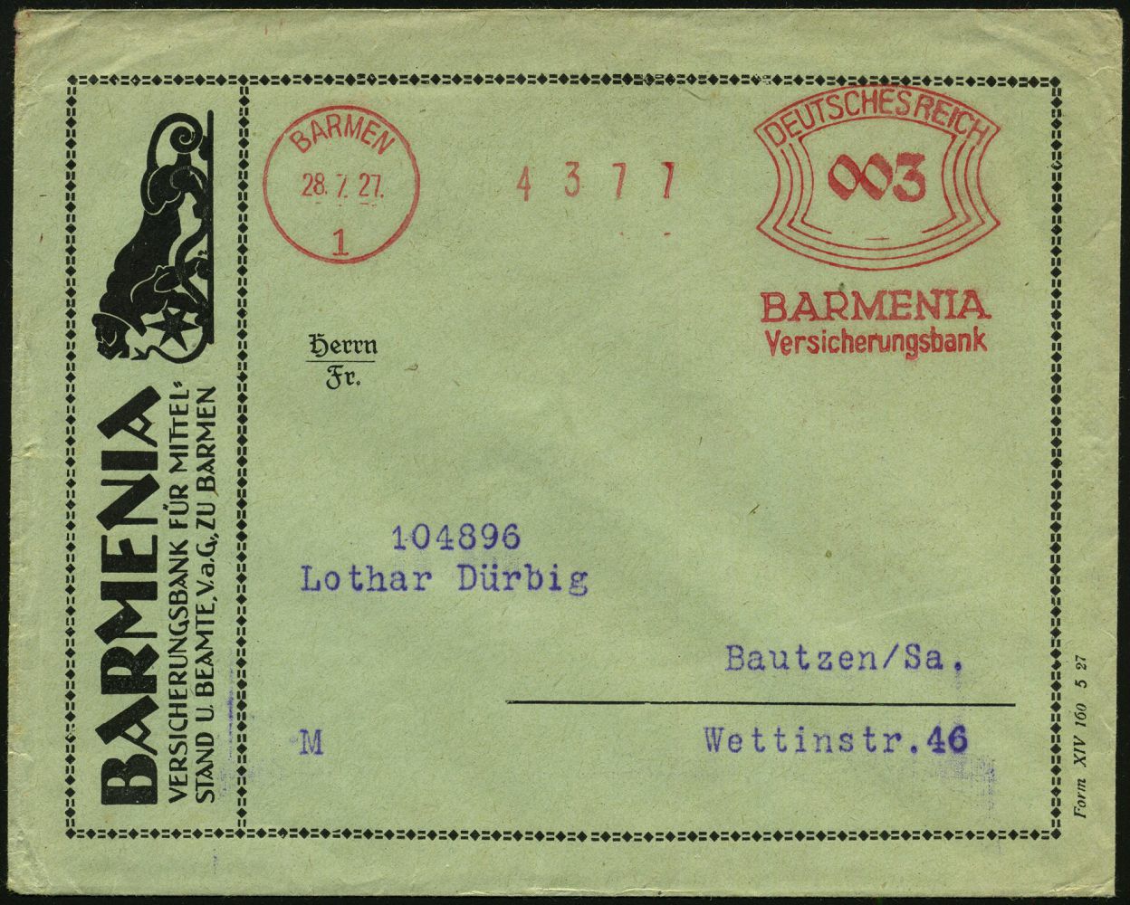 10182 | 20 € | 5600 WUPPERTAL (Absender-Freistempel) : BARMEN/ 1/ BARMENIA/ Versicherungsbank 1927 (28.7.) AFS Francotyp "Bogenrechteck" auf dekorativem Firmenbf.: BARMENIA.. mit Löwen-Firmenlogo (auch rs.) Fern-Bf. (Dü.E-1BAM, große Zählnr.) | ![]() ![]() ![]() ![]() | |