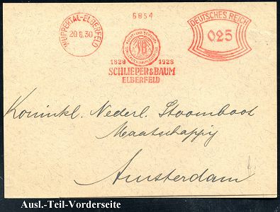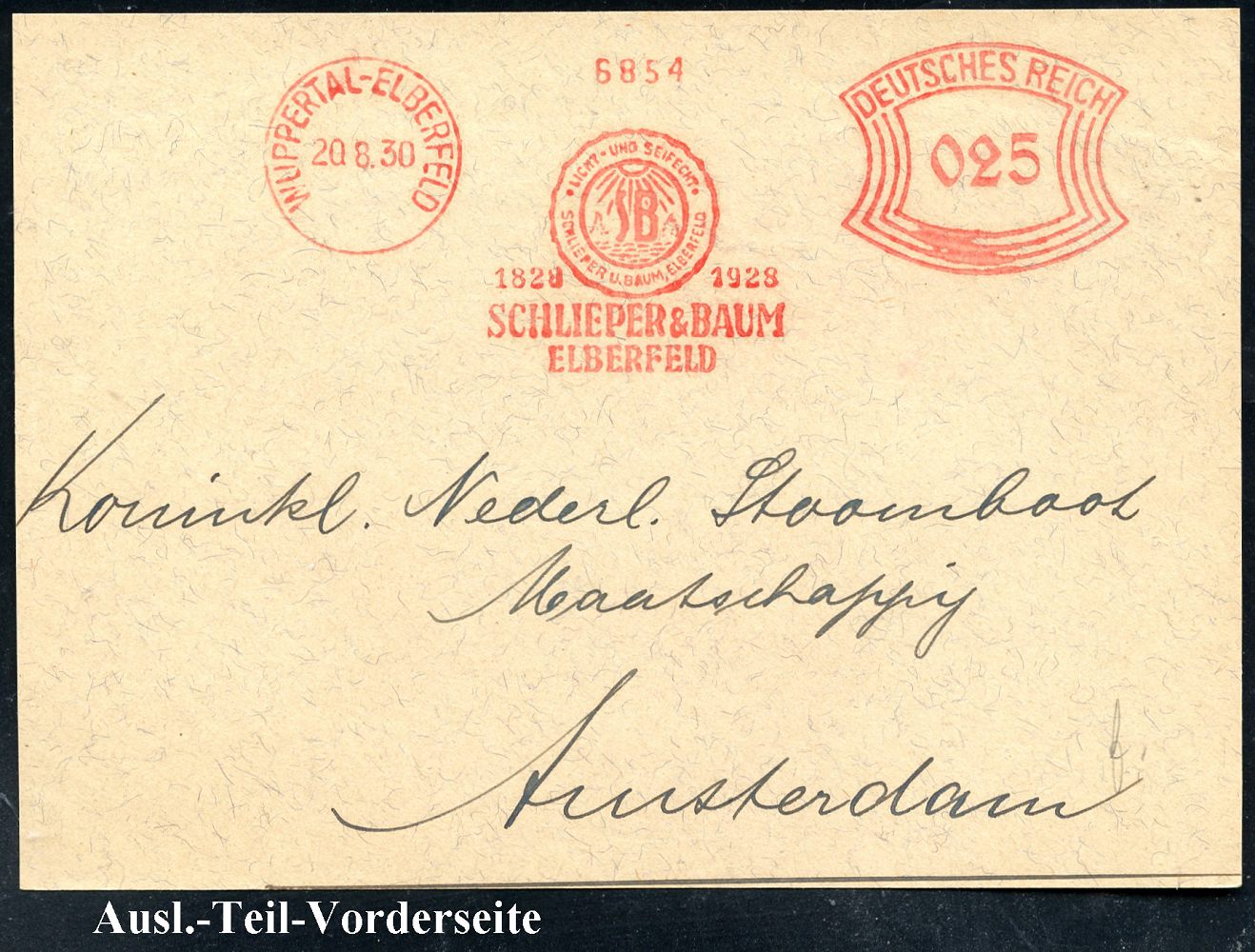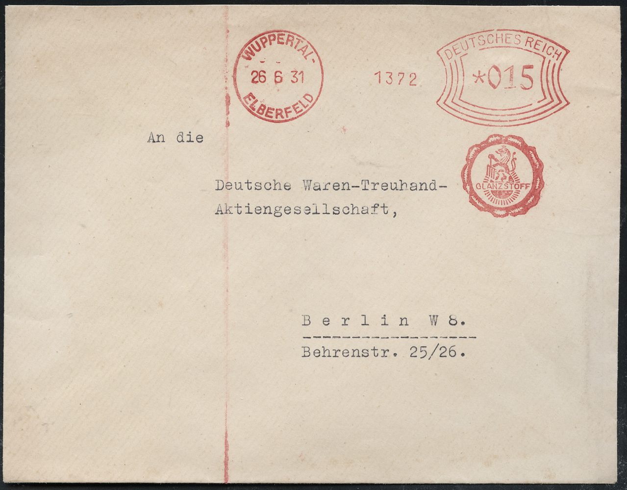 10191 | 20 € | 5600 WUPPERTAL (Absender-Freistempel) : WUPPERTAL-/ ELBERFELD/ GLANZSTOFF 1931 (26.6.) AFS Francotyp "Bogenrechteck" (Logo mit Löwe) rs. motivgl. Blindsiegel! (senkr. Spur der Frankiermaschine), Fern-Bf. (Dü.E-1Am) | ![]() ![]() | |