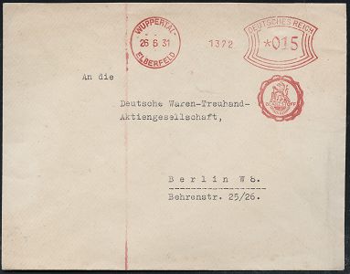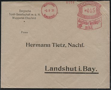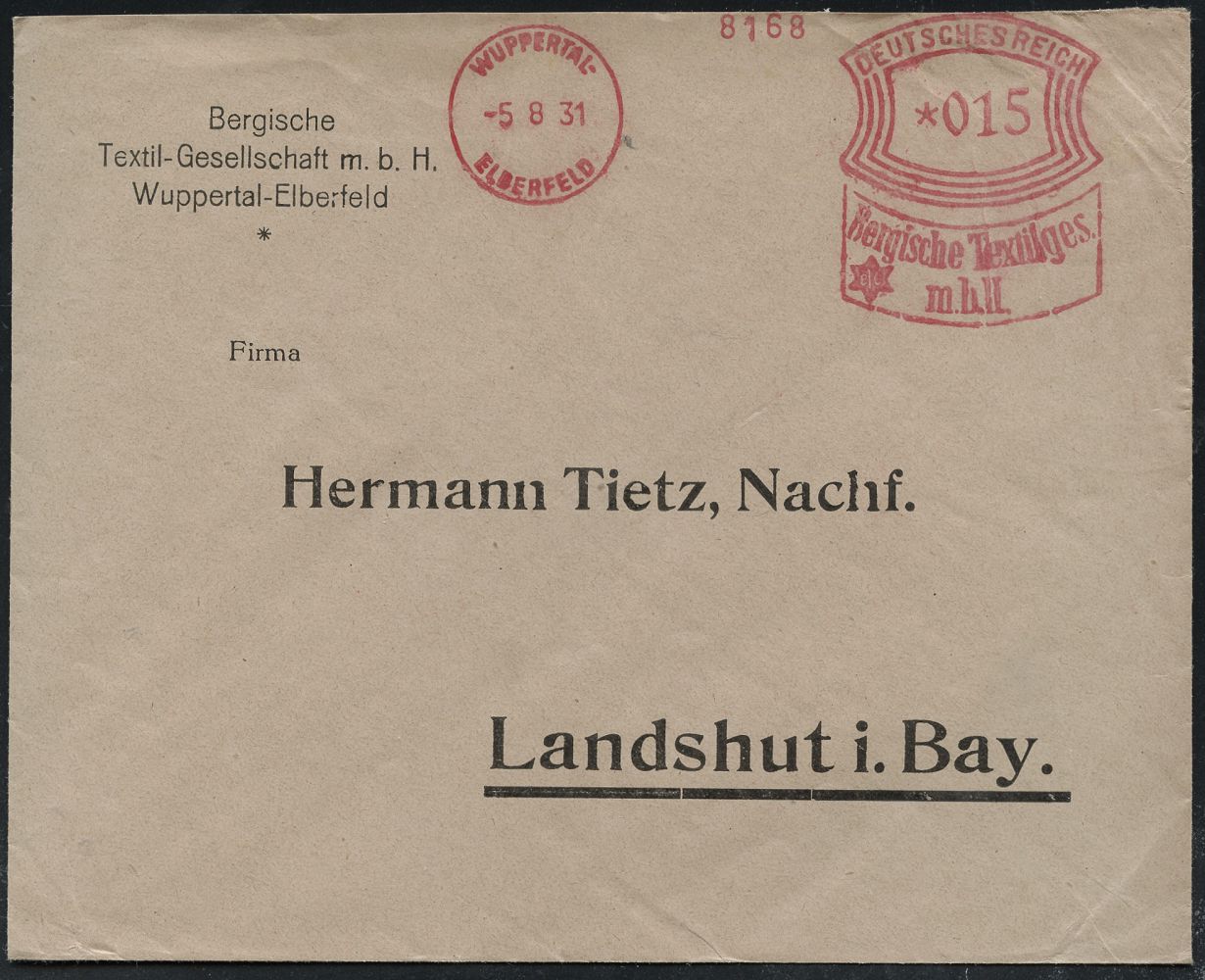 10193 | 20 € | 5600 WUPPERTAL (Absender-Freistempel) : WUPPERTAL-/ ELBERFELD/ Bergische Textilges./ mbH. 1931 (5.8.) AFS Francotyp "Bogenrechteck" (Logo: Davidstern) klar gest. Firmen-Fern-Bf. an Kaufhaus Tietz, Landshut (Dü.E-1Ah) | ![]() ![]() | |