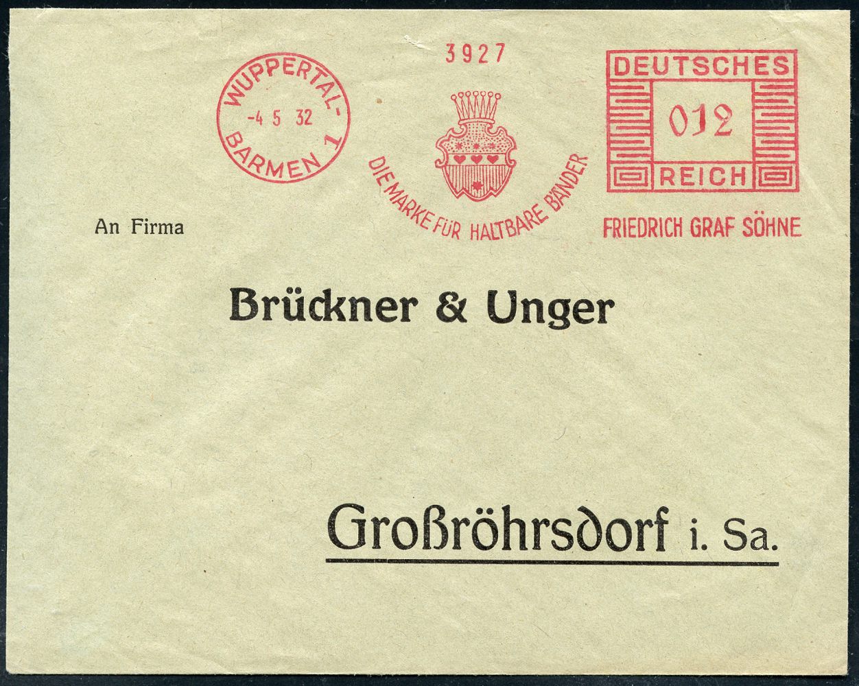 10196 | 23 € | 5600 WUPPERTAL (Absender-Freistempel) : WUPPERTAL-/ BARMEN 1/ DIE MARKE FÜR HALTBARE BÄNDER/ FRIEDR.GRAF SÖHNE 1932 (4.5.) AFS Francotyp "Mäanderrechteck" (Wappen mit Perlenkrone u. Herzen) klar auf Firmen-Bf. (Dü.E-2CEh) | ![]() | |