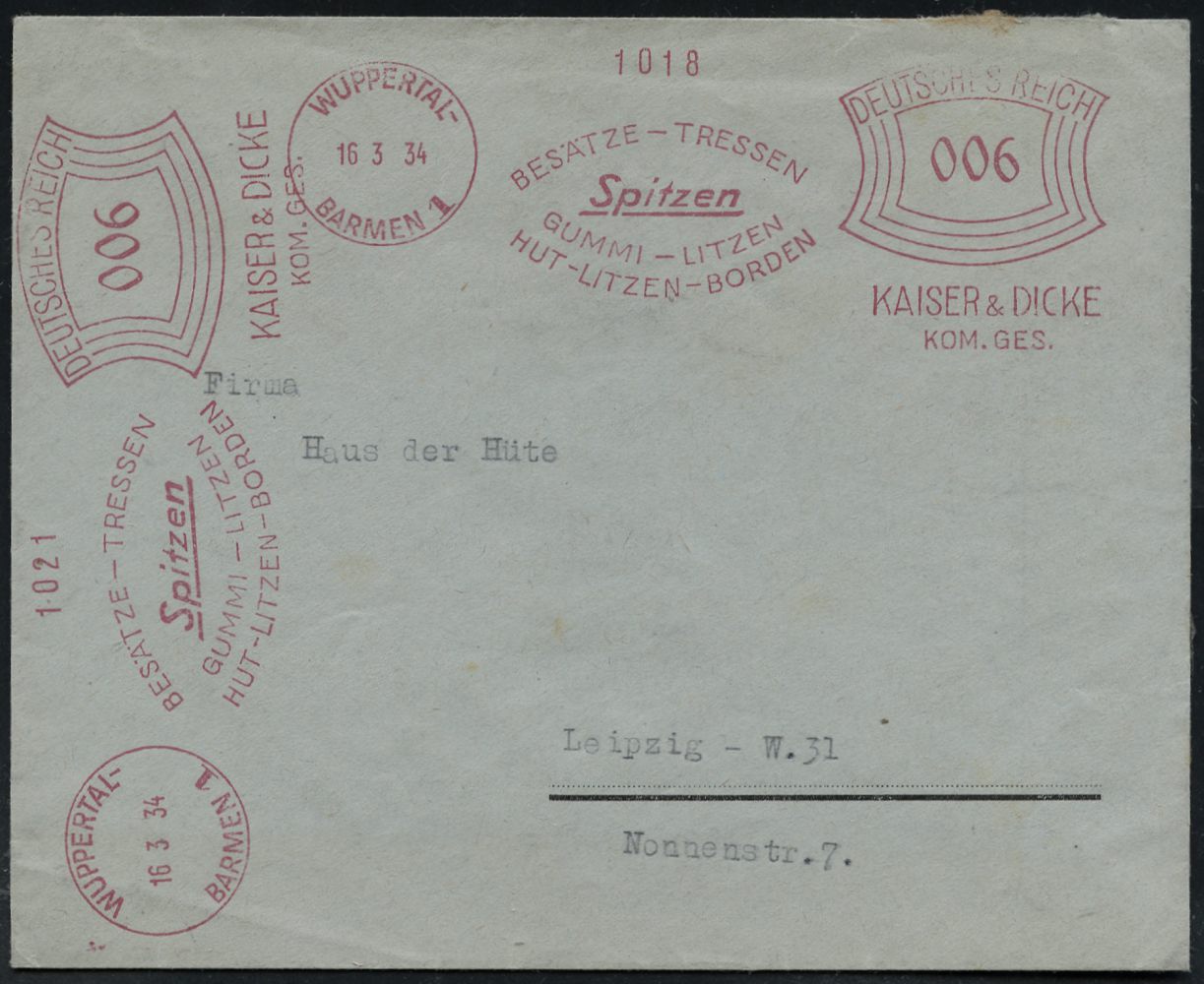 10200 | 25 € | 5600 WUPPERTAL (Absender-Freistempel) : WUPPERTAL-/ BARMEN 1/ BESÄTZE-TRESSEN/ Spitzen/ GUMMI-LITZEN/ HUT-LITZEN-BORDEN/ KAISER & DICKE 1934 (16.3.) AFS Francotyp "Bogenrechteck" 006 Pf. + 006 Pf. = 2 Abdrucke! (rs. Klappenriß) klar gest. Fern-Bf., 2 Abdrucke sind selten! (Dü.E-1CEh) | ![]() | |