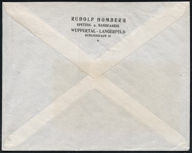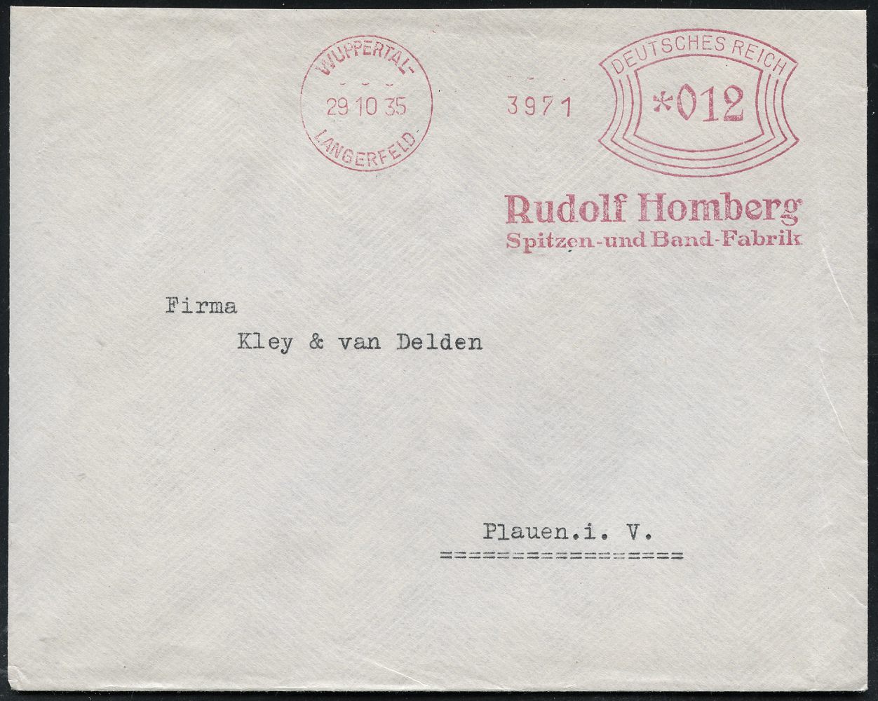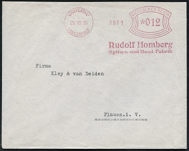 10207 | 22 € | 5600 WUPPERTAL (Absender-Freistempel) : WUPPERTAL-/ LANGERFELD/ Rudolf Homberg/ Spitzen-u.Band-Fabrik 1937 (29.10.) AFS Francotyp "Bogenrechteck" , rs. Abs.-Vordruck, klar gest. Fern-Firmen-Bf. (Dü.E-1Am) | ![]() ![]() ![]() | |
