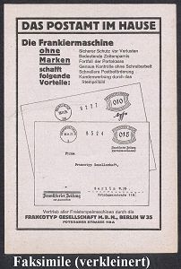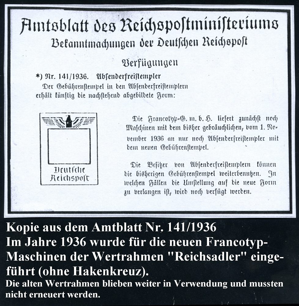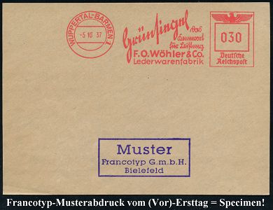 10228 | 35 € | 5600 WUPPERTAL (Absender-Freistempel) : WUPPERTAL-BARMEN 1/ Grünsiegel/ das/ Kennwort/ für Leistung/ F.O.Wöhler & Co./ Lederwarenfabrik 1937 (5.10.) AFS-Musterabdruck Francotyp "Reichsadler" , Text teils Sütterlin, glasklar gest. Francotyp-Musterblatt vom (Vor)-Ersttag!, selten! (Dü.E-5CGo) | ![]() ![]() | |