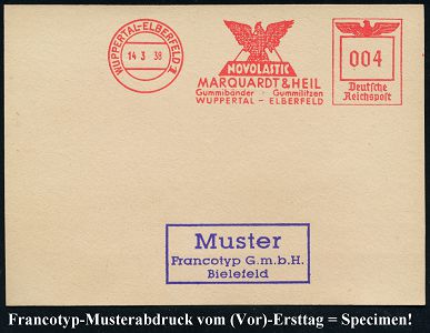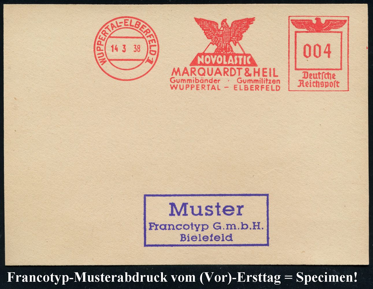 10237 | 35 € | 5600 WUPPERTAL (Absender-Freistempel) : WUPPERTAL-ELBERFELD 1/ NOVOLITH/ MARQUARDT & HEIL/ Gummibänder Gummilitzen.. 1938 (14.3.) AFS-Musterabdruck Francotyp "Reichadler" (Adler-Logo) glasklar gest. Francotyp-Musterblatt vom (Vor)-Ersttag!, selten! (Dü.E-5CGo) | ![]() ![]() | |
