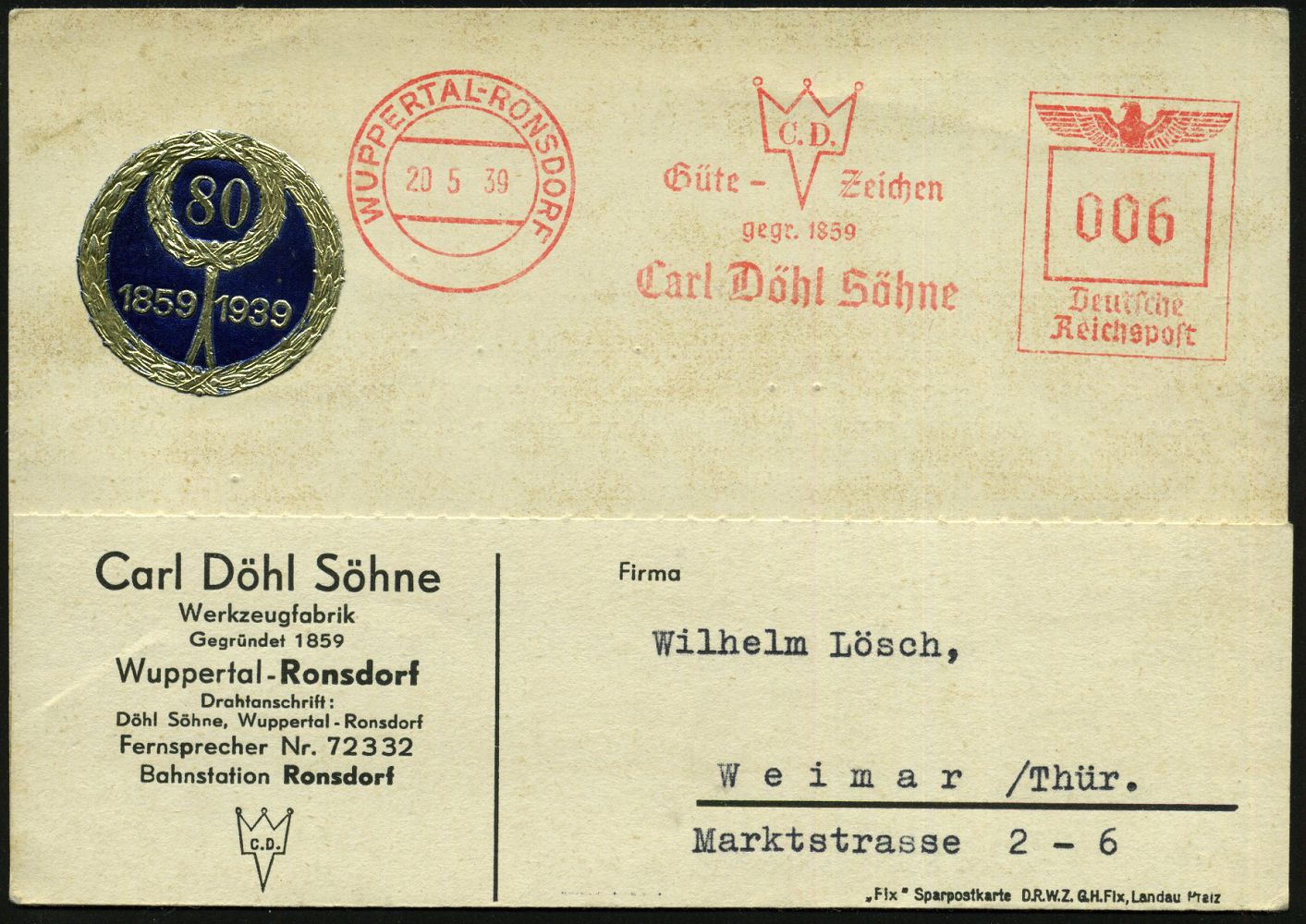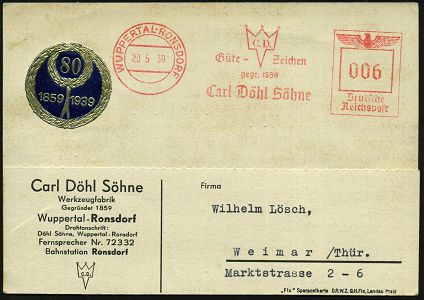 10247 | 20 € | 5600 WUPPERTAL (Absender-Freistempel) : WUPPERTAL-RONSDORF/ C.D./ ..gegr.1859/ Carl Döhl Söhne 1939 (20.5.) AFS Francotyp "Reichsadler" (Monogr.-Logo) + gold-schwarze Jubil.-Vignette: 80 (Jahre) 1859 1939, Firmenkt.: Carl Döhl Söhne Werkzeugfabrik.., vergl. Kat.-Nr. 10232, 10258 u. 10263 (Dü.E-5CG) | ![]() | |