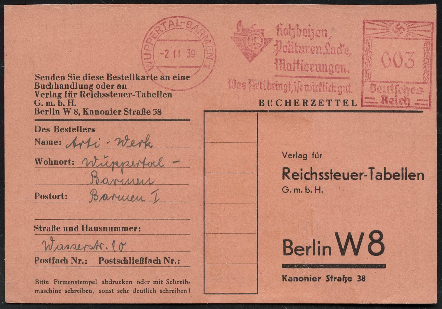 10252 | 20 € | 5600 WUPPERTAL (Absender-Freistempel) : WUPPERTAL-BARMEN 1/ Holzbeizen,/ Polituren,Lcke/ Mattierungen/ Was Arti bringt,ist wirklich gut 1939 (2.11.) AFS Francotyp "Hakenkreuz" (Logo mit Hobel) klar gest. Firmenkarte (Dü.E-3CEo) | ![]() ![]() | |