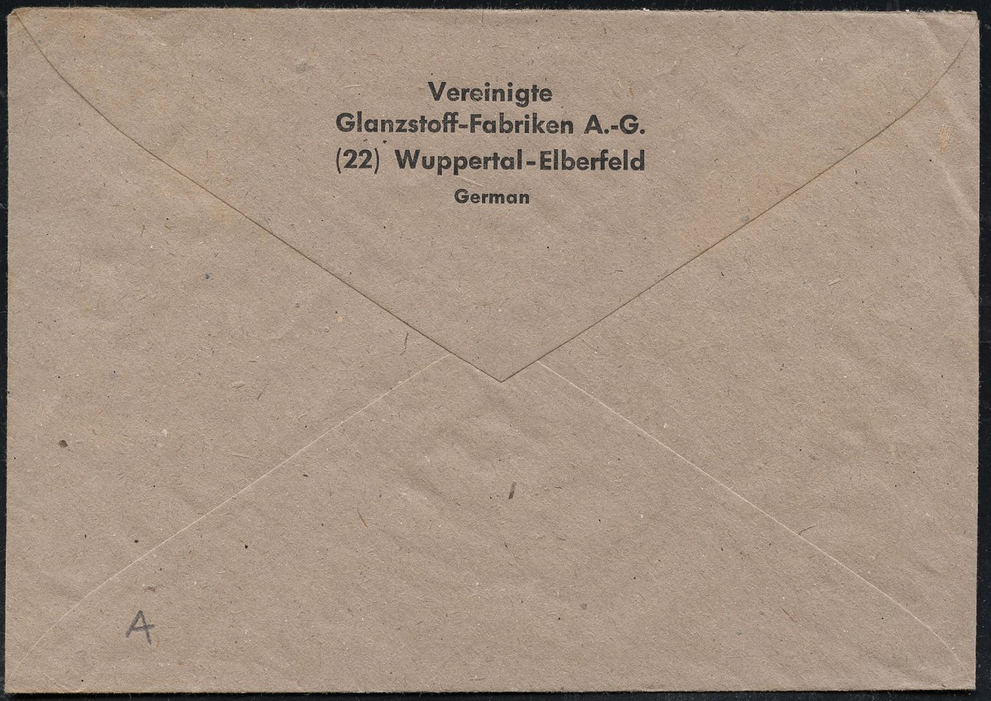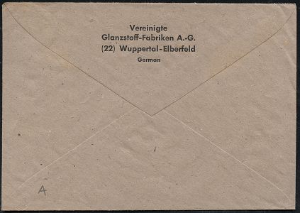 10265 | 25 € | 5600 WUPPERTAL (Absender-Freistempel) : WUPPERTAL-ELBERFELD/ Glanzstoff 1946 (11.7.) seltener, aptierter AFS Francotyp "Reichsadler" + Inschrift kompl. entfernt = Notmaßnahme! (Firmenlogo) zeitbedingt etw. schwach, rs. Abs.-Vordruck: Vereinigte Glazstoff-Fabriken AG, Fernbf. in die SBZ (Dü.E-13E-100o) | ![]() ![]() | |