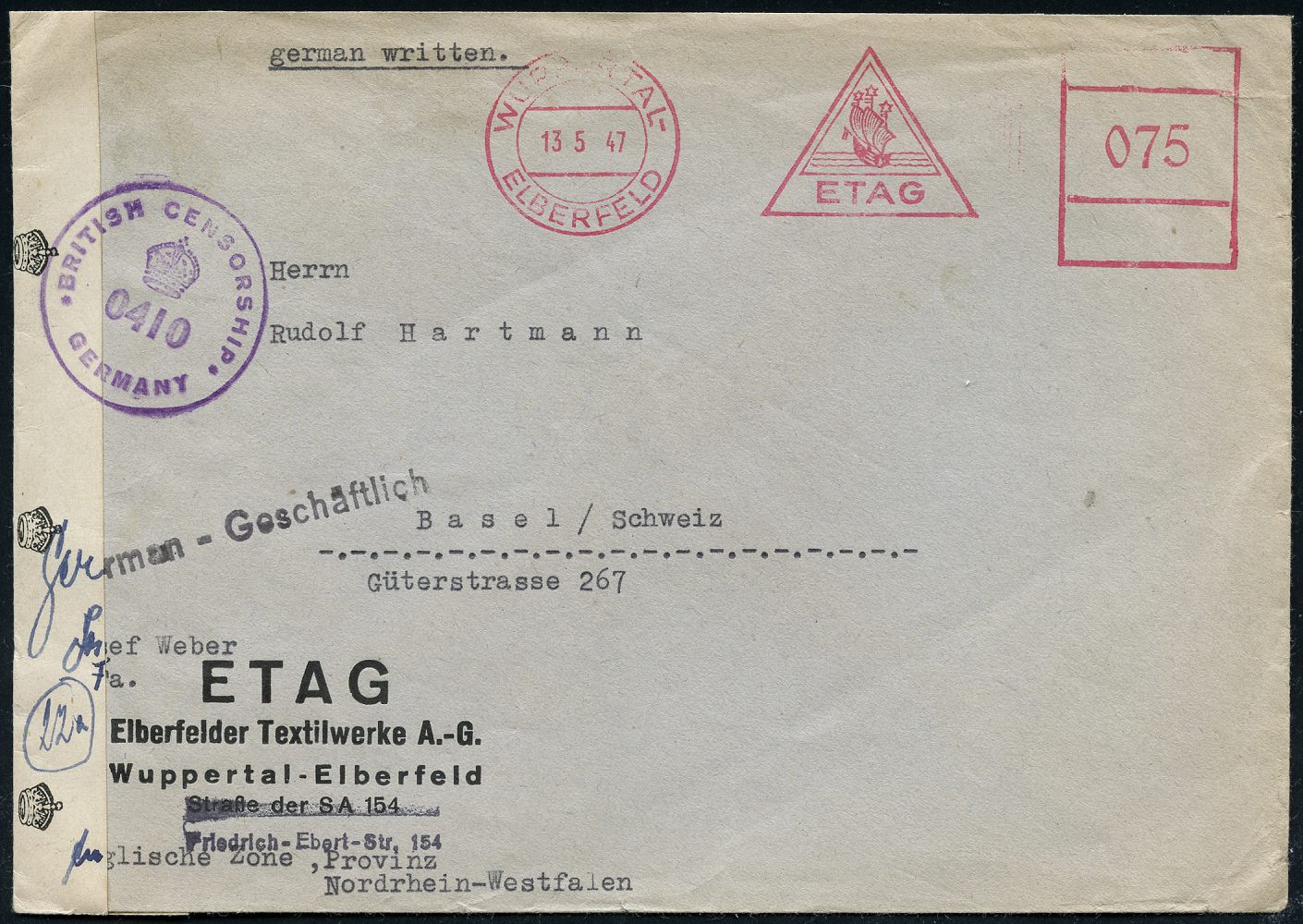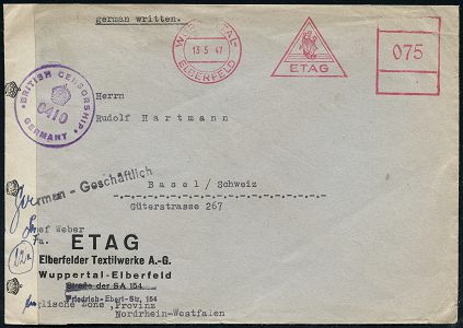 10269 | 35 € | 5600 WUPPERTAL (Absender-Freistempel) : WUPPERTAL-/ ELBERFELD/ ETAG 1947 (13.5.) aptirter AFS Francotyp "Hakenkreuz" = entfernt + Inschrift "Deutsche Reichspost" 075 Pf. (Firmen-Logo: Segelschiff) + brit. Zensurstreifen: OPENED BY EXAMINER/3104 + viol. 1K: BRITISH CENSORSHIP/0410/ GERMANY mit Krone (= Bonn) Firmen-Bf.: ETAG, Elberfelder Textilwerke AG.., Ausl.-Zensur-Bf. n. Basel, seltenes Porto, vergl. Kat.-Nr. 10203 (Dü.E-12AK-98o) | ![]() ![]() | |