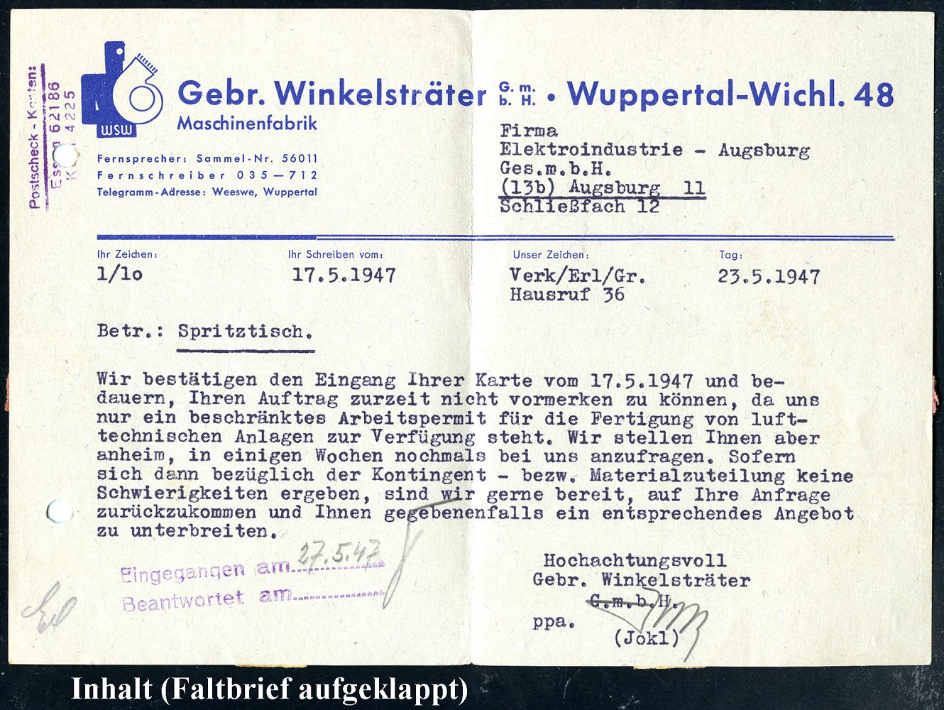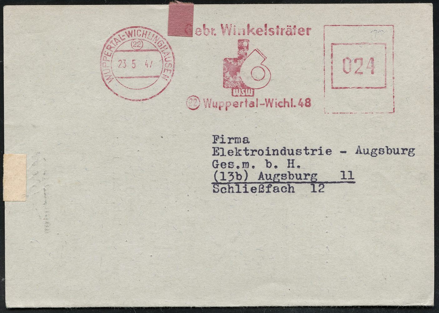 10270 | 25 € | 5600 WUPPERTAL (Absender-Freistempel) : (22) WUPPERTAL-WICHLINGHAUSEN/ Gebr.Winkelsträter/ WSW 1947 (23.5.) aptierter AFS Francotyp "Reichsadler" = entfernt = Notmaßnahme! (Logo: Figur mit Luftfilter) Faltbf. mit Inhalt u. gl. Motiv! (innen 1x gelocht) n. Augsburg, vergl. Kat.-Nr. 10274 (Dü.E-13AK-129o) | ![]() ![]() | |