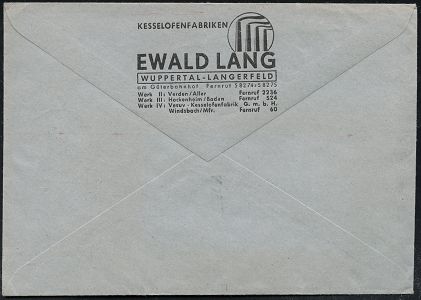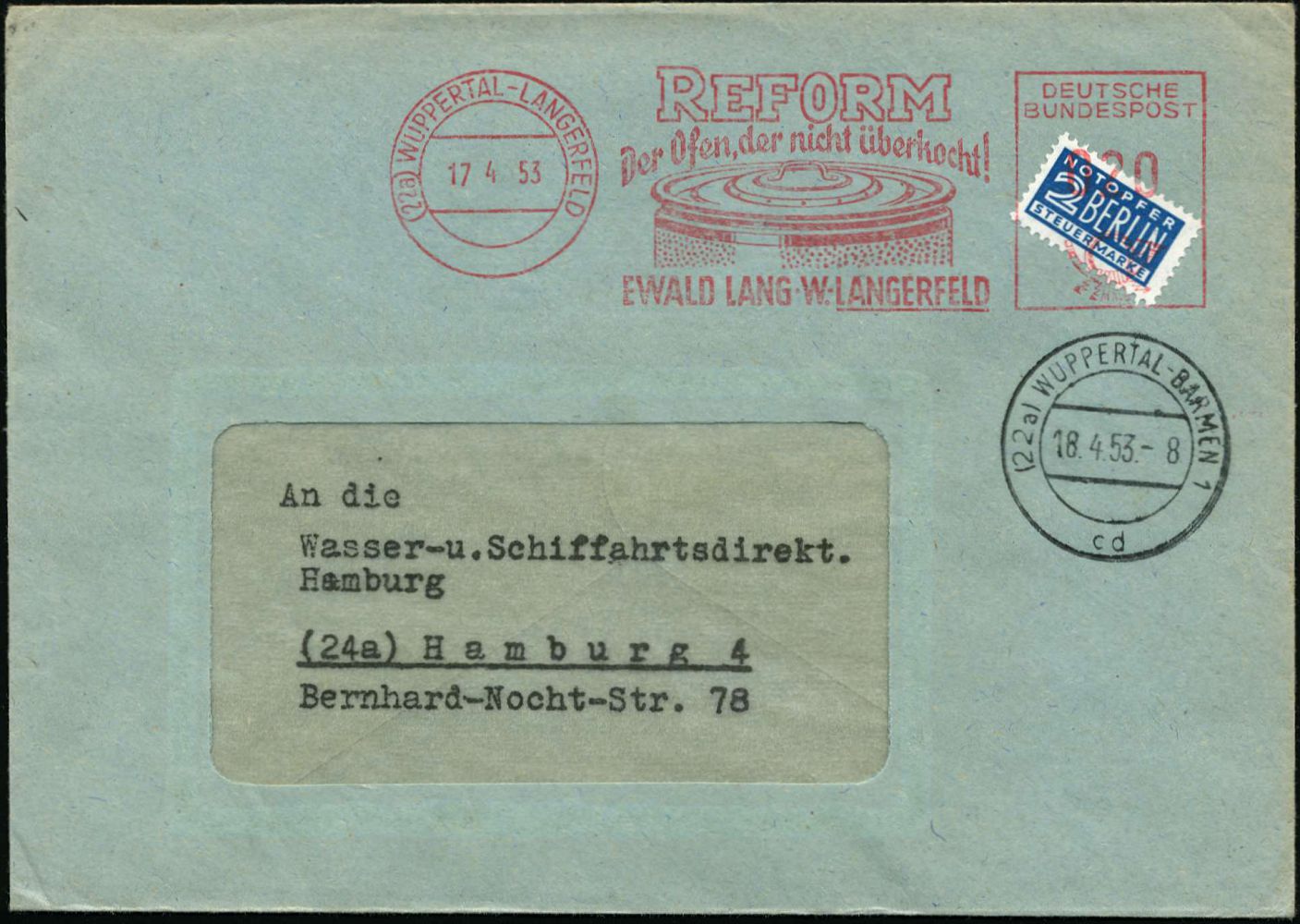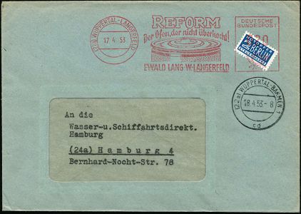 10286 | 18 € | 5600 WUPPERTAL (Absender-Freistempel) : (22a) WUPPERTAL-LANGERFELD/ REFORM/ Der Ofen,der nicht überkocht!/ E.LANG 1953 (17.4.) AFS Francotyp (Kessel) auf 2 Pf.NoB (= Vorausentwertungl) + 2K-Steg: (22 a) WUPPERTAL-BARMEN 1/cd = Datumskorrektur!, rs. Abs.-Reklame: KESSELOFENFABRIKEN EWALD LANG (Dü.E-23CO) | ![]() ![]() | |