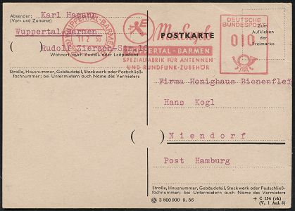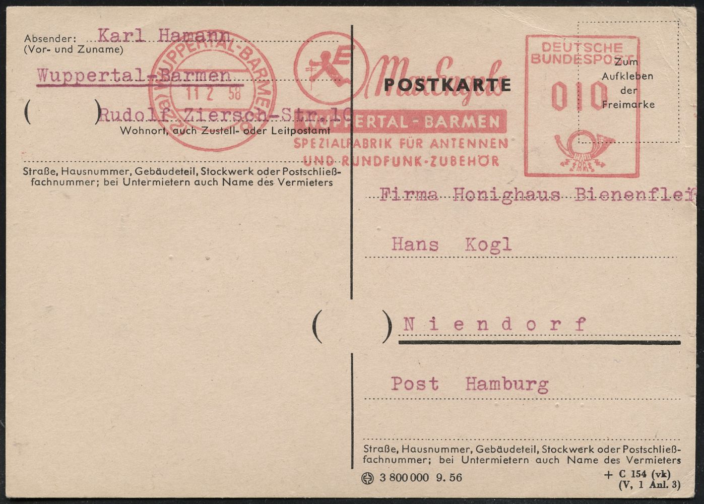 10291 | 15 € | 5600 WUPPERTAL (Absender-Freistempel) : (22a) WUPPERTAL-BARMEN 6/ Max Engel/ SPEZIALFABRIK FÜR ANTENNEN.. 1958 (11.2.) AFS Francotyp (Firmenlogo: stilis. Engel montiert Antenne) Inl.-Karte (Dü.E-23CG) | ![]() | |