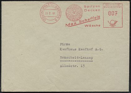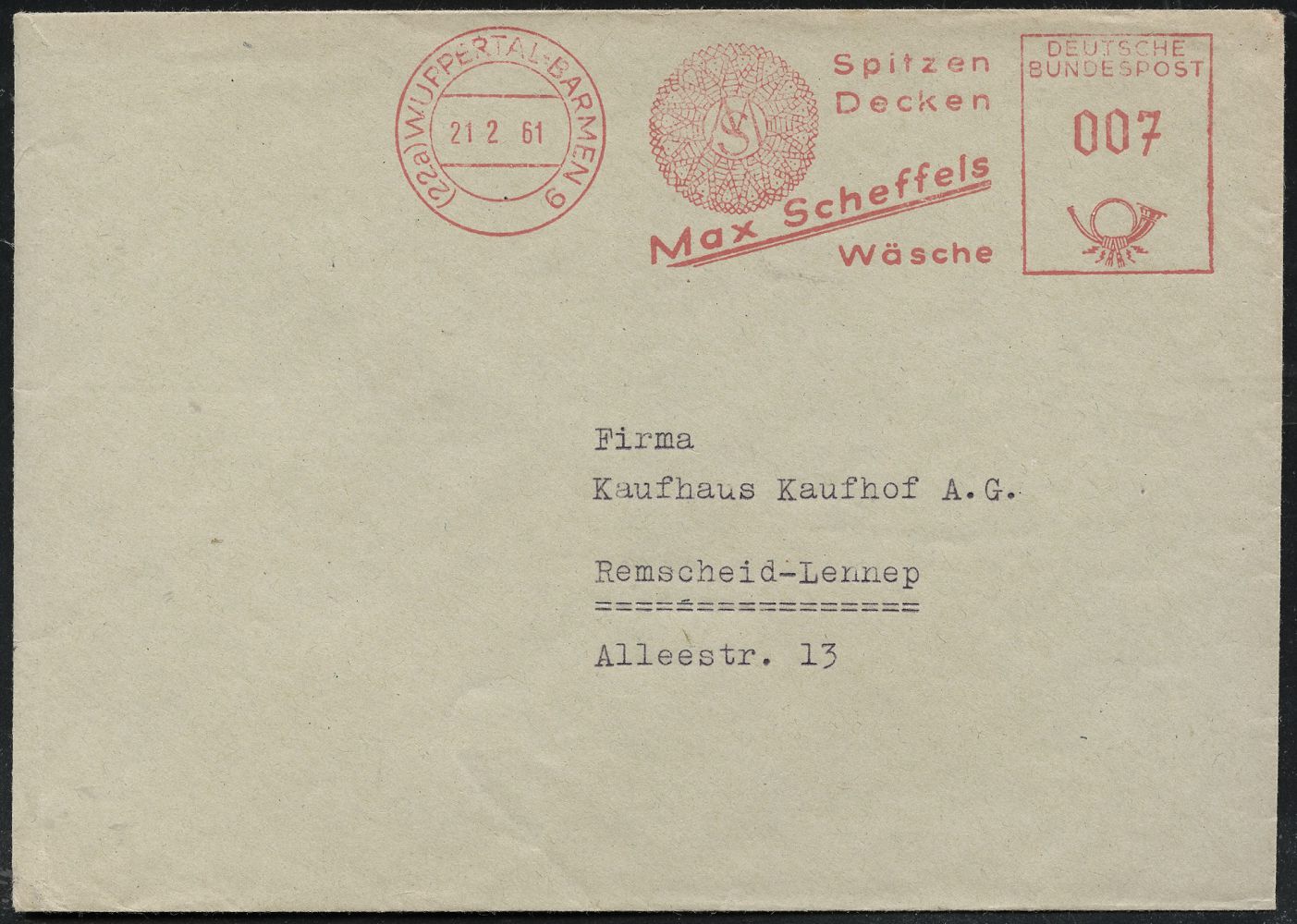 10294 | 16 € | 5600 WUPPERTAL (Absender-Freistempel) : (22a) WUPPERTAL-BARMEN 9/ Spitzen/ Decken/ Max Scheffels.. 1961 (21.2.) AFS Francotyp (Firmenlogo: Spitzendecke!) klar gest. Inl.-Bf., schönes Motiv! (Dü.E-23CG) | ![]() | |