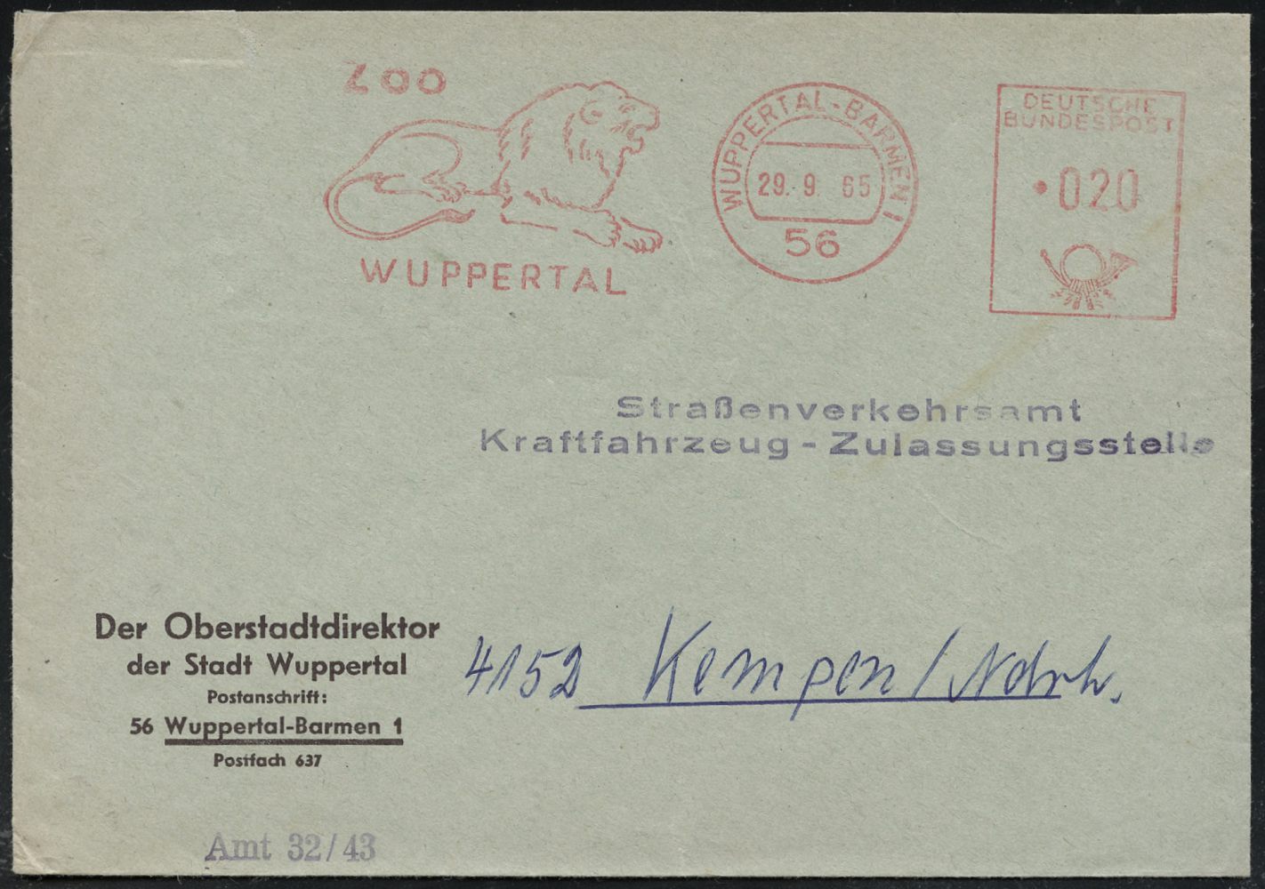 10299 | 15 € | 5600 WUPPERTAL (Absender-Freistempel) : 56 WUPPERTAL-BARMEN 1/ ZOO/ WUPPERTAL 1965 (29.9.) AFS Francotyp (= Löwe) klar auf Kommunalbf.: Der Oberstadtdirektor.. + 1L: Amt 32/43 (Dü.E-26) | ![]() | |