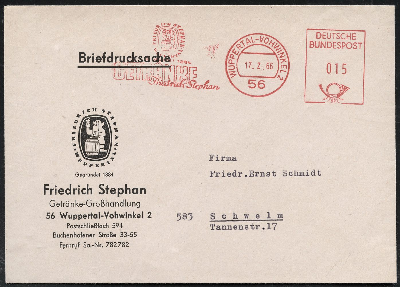 10300 | 15 € | 5600 WUPPERTAL (Absender-Freistempel) : 56 WUPPERTAL-VOHWINKEL 2/ FRIEDRICH STEPHAN/ ..GETRÄNKE.. 1966 (17.2.) AFS Postalia (Firmenlogo: Zwerg mit Bierfaß) motivgl. Firmenbf. + Postalia-Faksimile (Dü.E-26 B) | ![]() ![]() | |