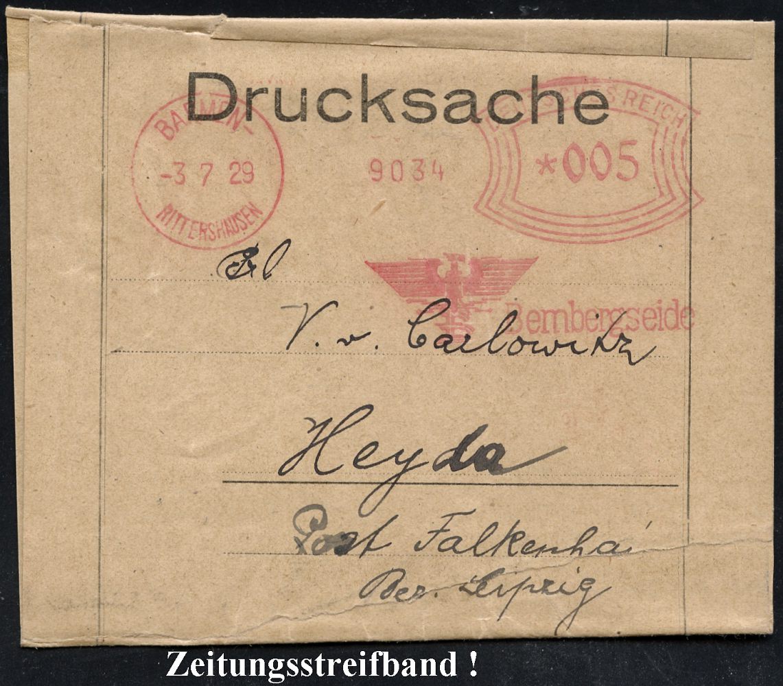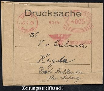 10183 | 18 € | 5600 WUPPERTAL (Absender-Freistempel) : BARMEN-/ RITTERSHAUSEN/ Bemberseide 1929 (3.7.) AFS Francotyp "Bogenrechteck" mit kleiner, mittlerer Zählnr., 005 Pf. (Adler-Firmenlogo) auf kleinem Zeitungsstreifband ! (unten gr. Riß geschl.), seltene Verwendung u. Portostufe! (Dü.E-1Am) | ![]() ![]() | |