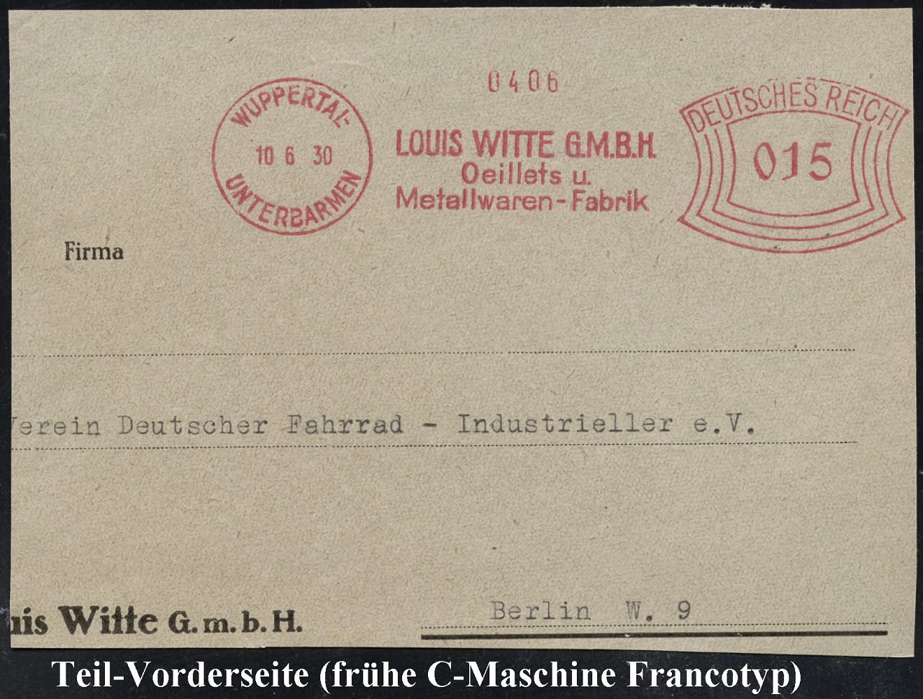 10184 | 15 € | 5600 WUPPERTAL (Absender-Freistempel) : WUPPERTAL-/ UNTERBARMEN/ LOUIS WITTE GMBH/ Oeillets u./ Metallwaren-Fabrik 1930 (10.6.) AFS Francotyp "Bogenrechteck", C-Maschine ! klar auf Teil-Vorderseite (Dü.E-1CEh) | ![]() ![]() | |