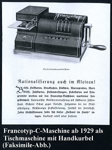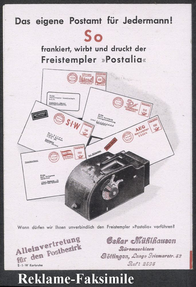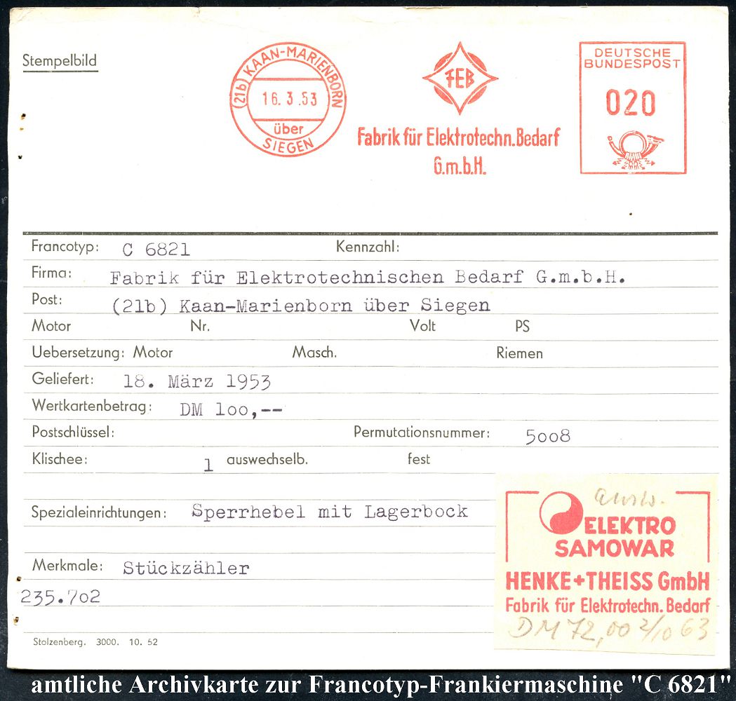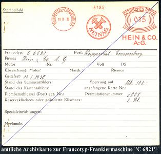 10185 | 75 € | 5600 WUPPERTAL (Absender-Freistempel) : WUPPERTAL-CRONENBERG/ HEINAG/ HEIN & CO/ A.-G. 1930/63 AFS Francotyp "Bogenrechteck" (Firmenlogo: 2 Schrauben) postamtliche Archivkarte mit Maschinen-Nr. "C 6821" u. div. hs. Eintragungen (Datum der Erstzulassung) + 2 amtl. Archivkarte nach Weiterverkauf (1953) nach KAAN-MARIENBORN (SIEGEN) an Fa. FEB + Klischee-Abdruck Fa. HENKE + THEISS 1963 (je 2 kl. Heftklammerspuren), 2 seltene Unikate, Entwicklung einer Francotyp-C-Maschine ! (Dü.E-1CEh wurde E-23CO !) | ![]() ![]() ![]() | |