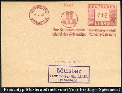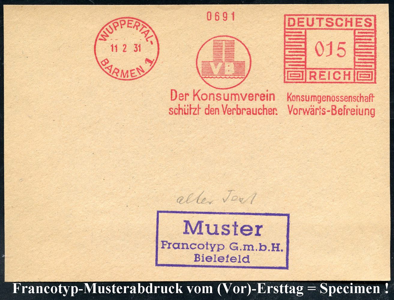 10188 | 35 € | 5600 WUPPERTAL (Absender-Freistempel) : WUPPERTAL-/ BARMEN 1/ Der Konsumverein/ schützt den Verbraucher/ Konsumgenossenschaft/ Vorwärts-Befreiung 1931 (11.2.) AFS-Musterabdruck Francotyp "Mäanderrechteck", C-Maschine (Monogr.-Logo) glasklar gest. Francotyp-Musterblatt vom (Vor)-Ersttag !, selten! (Dü.E-2CEh) | ![]() ![]() | |