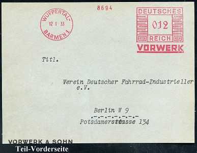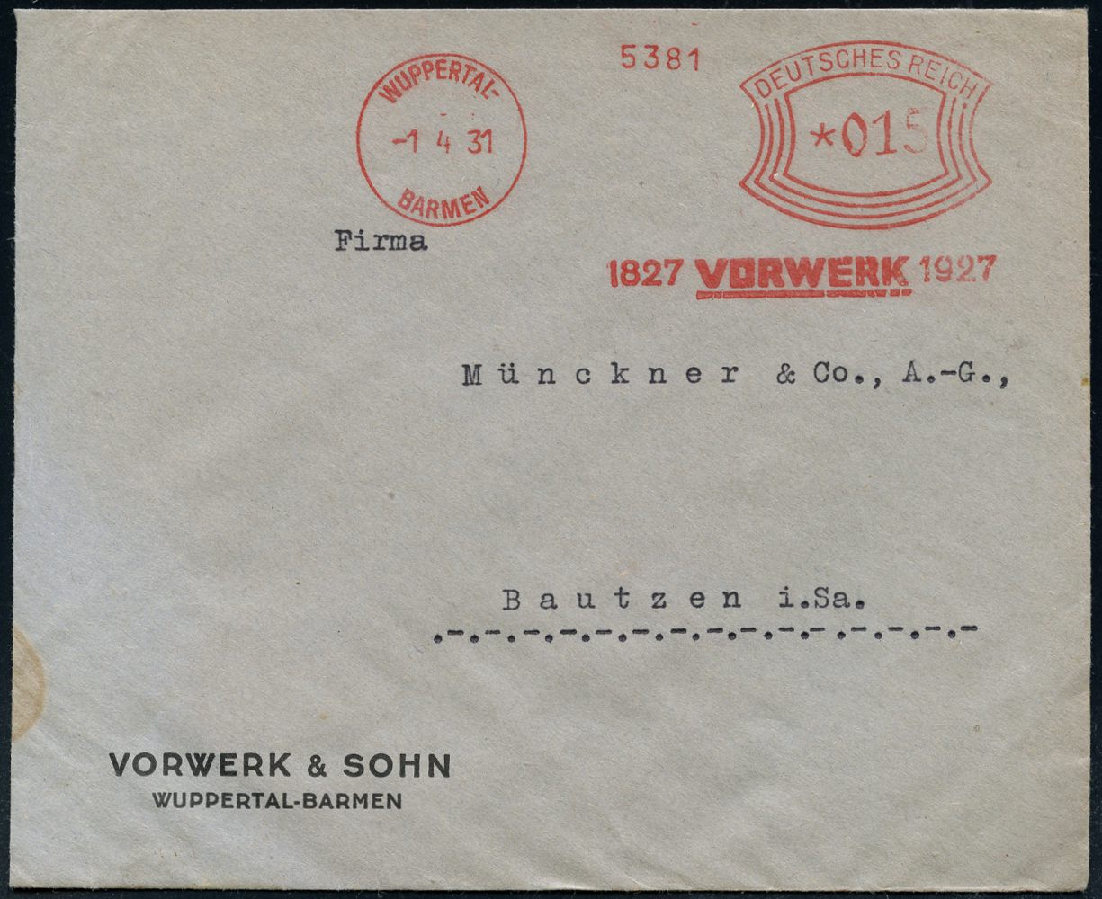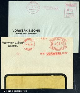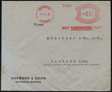 10190 | 25 € | 5600 WUPPERTAL (Absender-Freistempel) : WUPPERTAL-/ BARMEN/ 1827 VORWERK 1927 1931 (1.4.) Jubil.-AFS Francotyp "Bogenrechteck" auf Firmen-Bf. = Firma für elektrische Apparate (Dü.E-1Ah) | ![]() ![]() | |