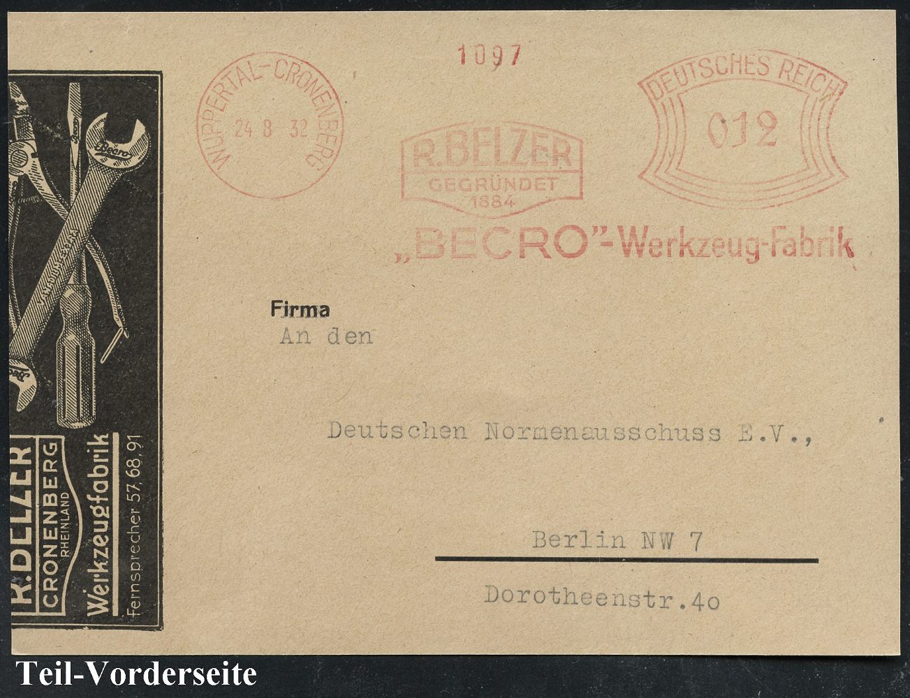 10197 | 15 € | 5600 WUPPERTAL (Absender-Freistempel) : WUPPERTAL-CRONENBERG/ R.BELZER/ GEGRÜNDET/ 1884/ "BECRO"-Werkzeug-Fabrik 1932 (24.8.) AFS Francotyp "Bogenrechteck" auf Reklame-Teil-Vorderseite (Dü.E-1CEh) | ![]() | |