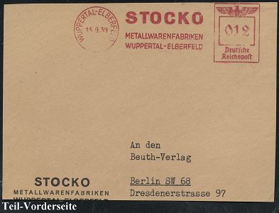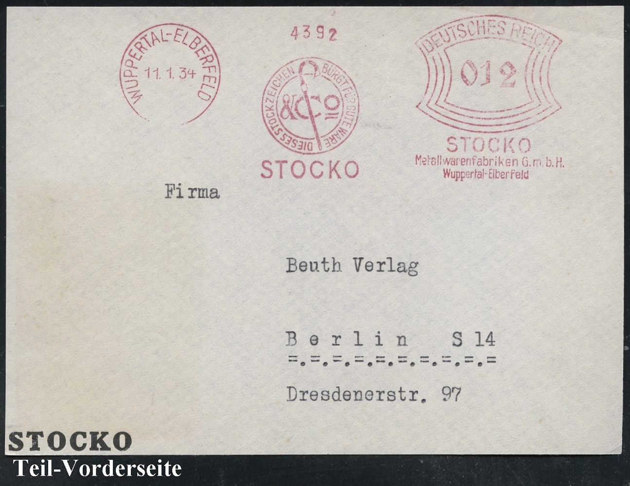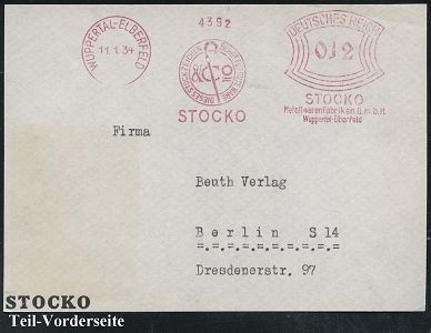 10199 | 25 € | 5600 WUPPERTAL (Absender-Freistempel) : WUPPERTAL-ELBERFELD/ STOCKO/ Metallwarenfabriken.. 1934/39 2 verschiedene AFS Francotyp "Bogenrechteck" bzw. "Reichsadler" (1x Firmenlogo "Spzierstock") je auf Teil-Vorderseite, 2 Belege (Dü.E-1BAh, E-5BAo) | ![]() ![]() | |